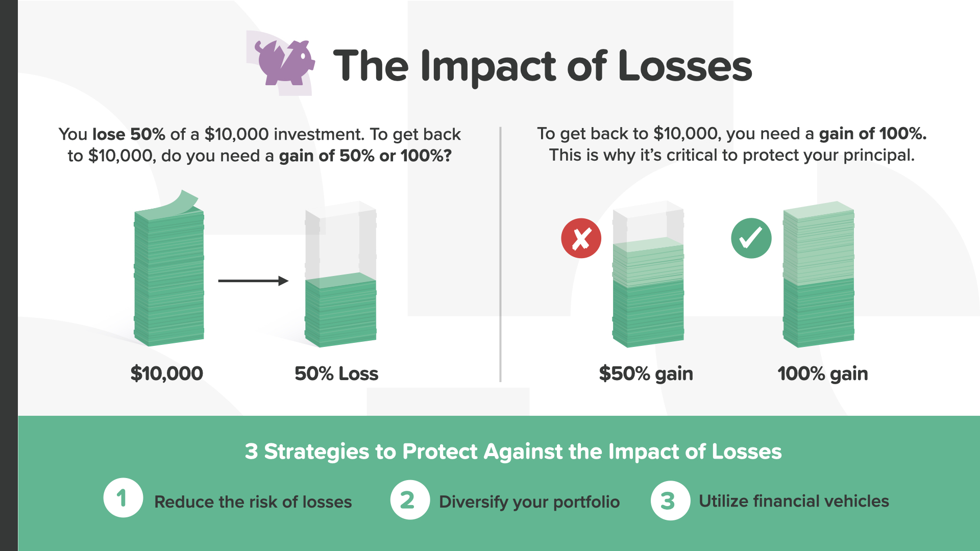 The next enemy of building wealth is the impact of losses. Often underestimated, it’s a threat that can wreck your savings goals and force you to adjust your lifestyle in retirement. Here’s a simple picture that illustrates how people miscalculate the impact of losses. If you were to lose 50% of your investment (which has happened twice in the stock market in the last 20 years), what percentage of gain would you need to get back to 100%? The answer is 50%—right? WRONG! It takes a 100% gain after a 50% loss to get back to even. That’s not easy to do, which is why it’s so important to protect what you already have. Maybe this is the reason why Warren Buffett famously said this about investing, "Rule No. 1: Never lose money. Rule No. 2: Never forget rule No. 1.” So what can you do to prevent losses? First, look at every option to reduce the risk. Second, consider how best to diversify your portfolio. And third, utilize the right financial vehicles for your situation. Remember, don’t procrastinate. Consider inflation. And talk with your financial professional about ways to reduce—or remove—the impact of losses from your strategy.