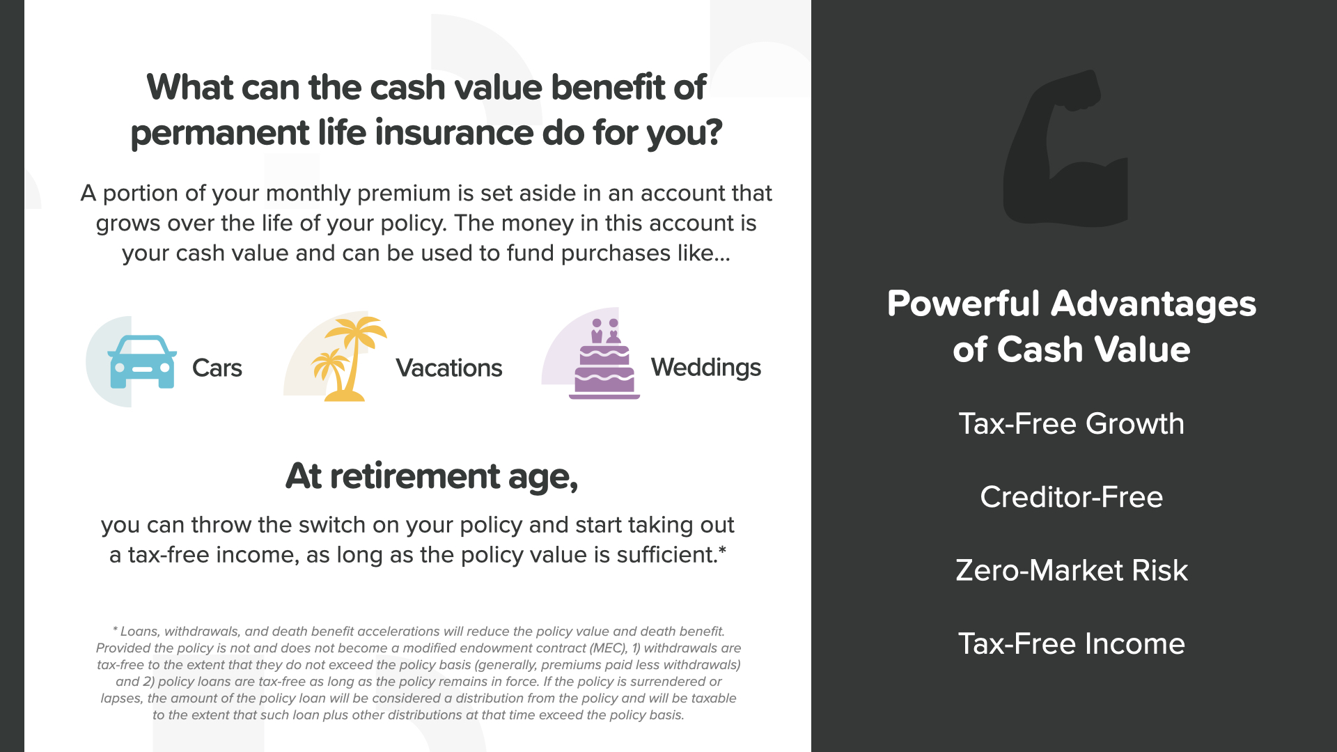Let’s talk about what the cash value component of permanent life insurance is and why it can be so important. A portion of your monthly premium is set aside in an account that grows over the life of your policy. The money in that account is your cash accumulation and can be used to fund future purchases—you see a few possibilities on the screen there. In addition to no market risk, tax-free growth, income, and legacy as we just mentioned, life insurance cash value can also be creditor-proof—meaning creditors can’t come after it. When you look at them all together, the advantages of the cash value benefit are very powerful.