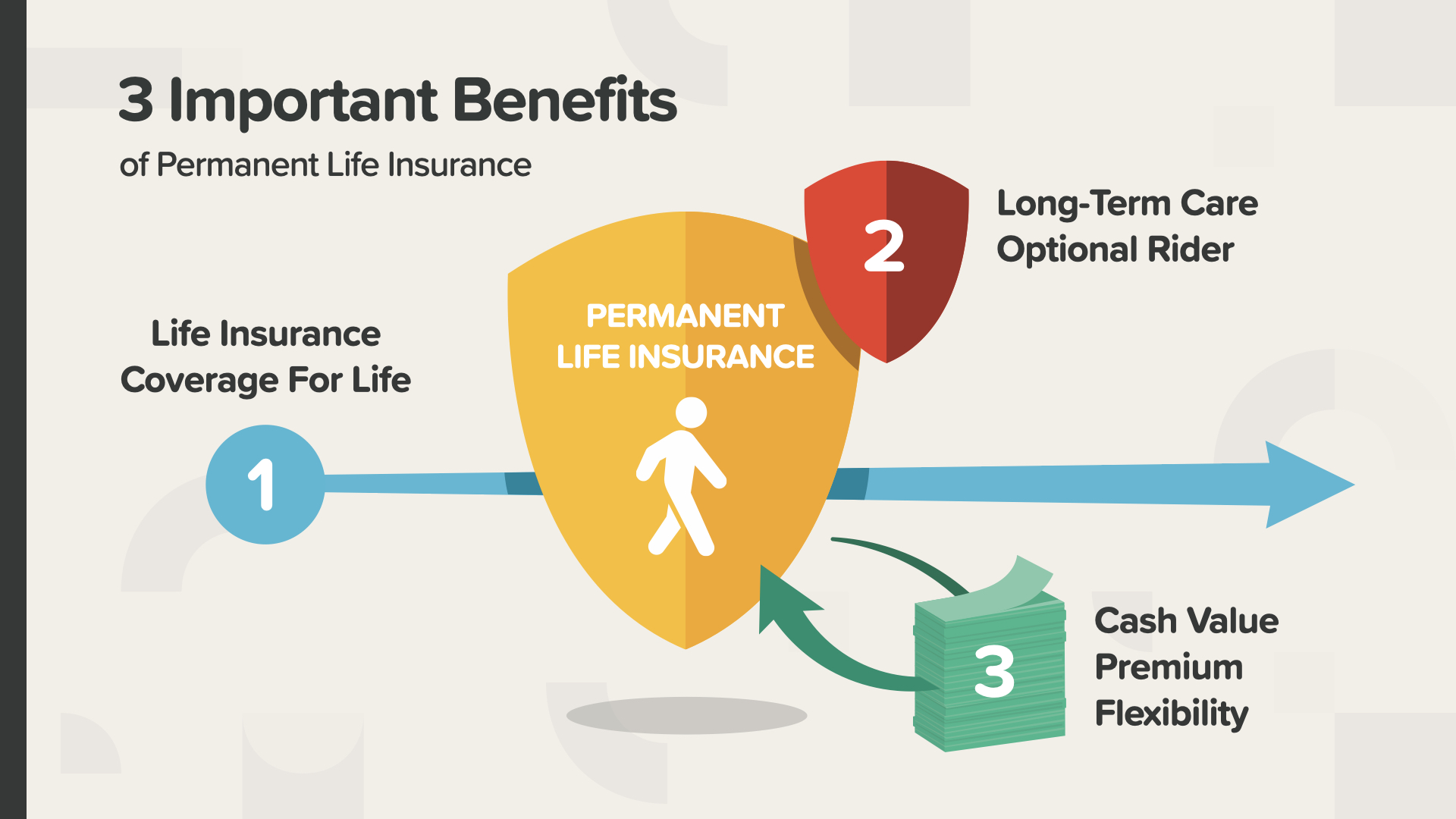 There are 3 important benefits of permanent life insurance. Number one is life insurance protection for your entire life. Two—with many permanent life policies, you can add long-term care as an optional rider. And number three is your accumulated cash value, which can give you flexibility with the premiums—this means if you ever can’t pay your premiums for some reason, they can be paid out of your cash value.