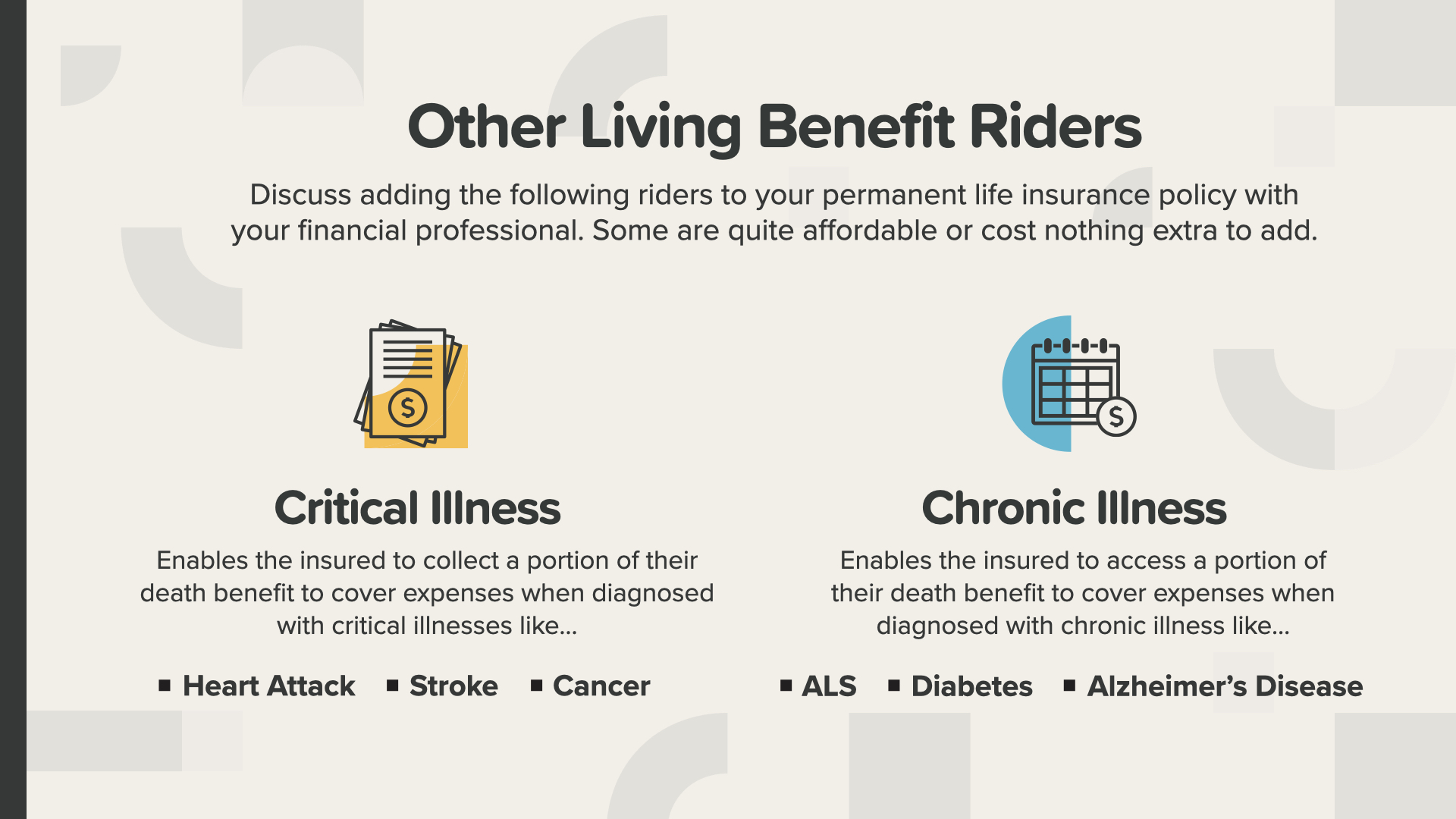 Long-term care riders aren’t the only riders available. You can also consider other living benefits like critical and chronic illness riders that can help save the day if you face any of the health challenges like you see on the screen. You should discuss adding these riders to your permanent life insurance policy with your financial professional. Some are inexpensive or even cost nothing extra to add.