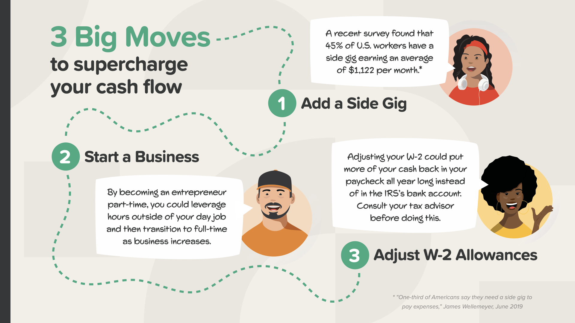 Or Maybe Start a Business - Low-cost business opportunities are out there. Find a problem people have and figure out how to solve it. By becoming an entrepreneur part-time, you could leverage time outside of your day job. As your income increases, a moment could soon come when you transition away from being an employee to being a full-time entrepreneur with even more control of your cash flow.