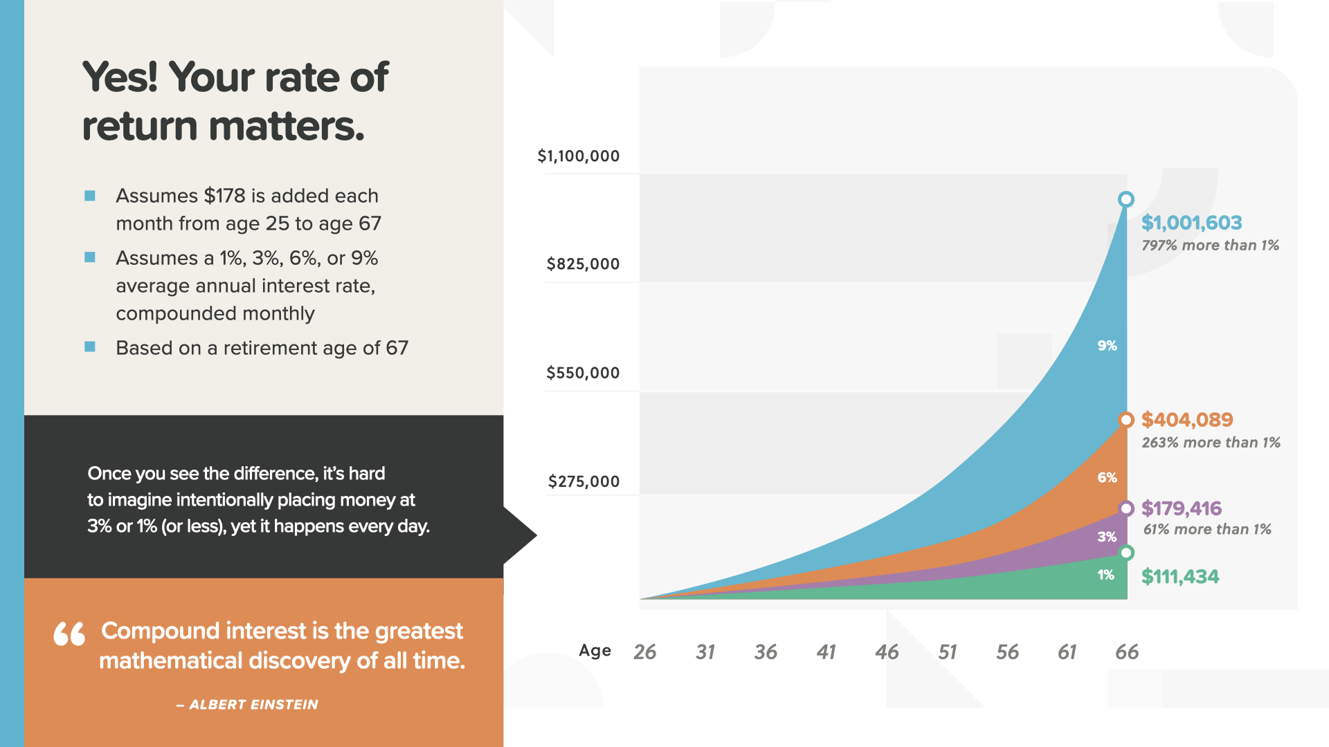 The amount added per month and the time are the same. The only change is the rate of return. This could mean as much as 797% more money at 9% vs. 1%—that’s almost a $900,000 difference! As you can see, your rate of return could be the defining factor that closes your retirement savings gap or leaves you with a significant shortfall. That’s why Albert Einstein said compounding interest was the greatest mathematical discovery of all time!