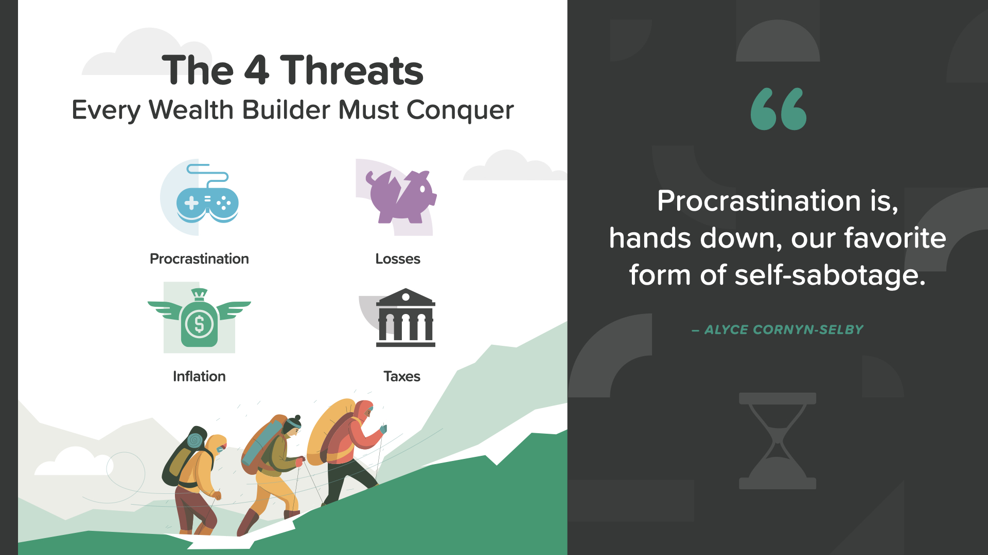 In addition to that, there are 4 threats every wealth builder must conquer. Think of these as your wealth building enemies. Each will come at you from a different direction. To beat them, we’ll have to address them individually. Let’s start with one of the worst—procrastination. As one quote says, procrastination is, hands down, our favorite form of self-sabotage. Then, we’ll pick apart market losses, inflation, and of course, taxes.