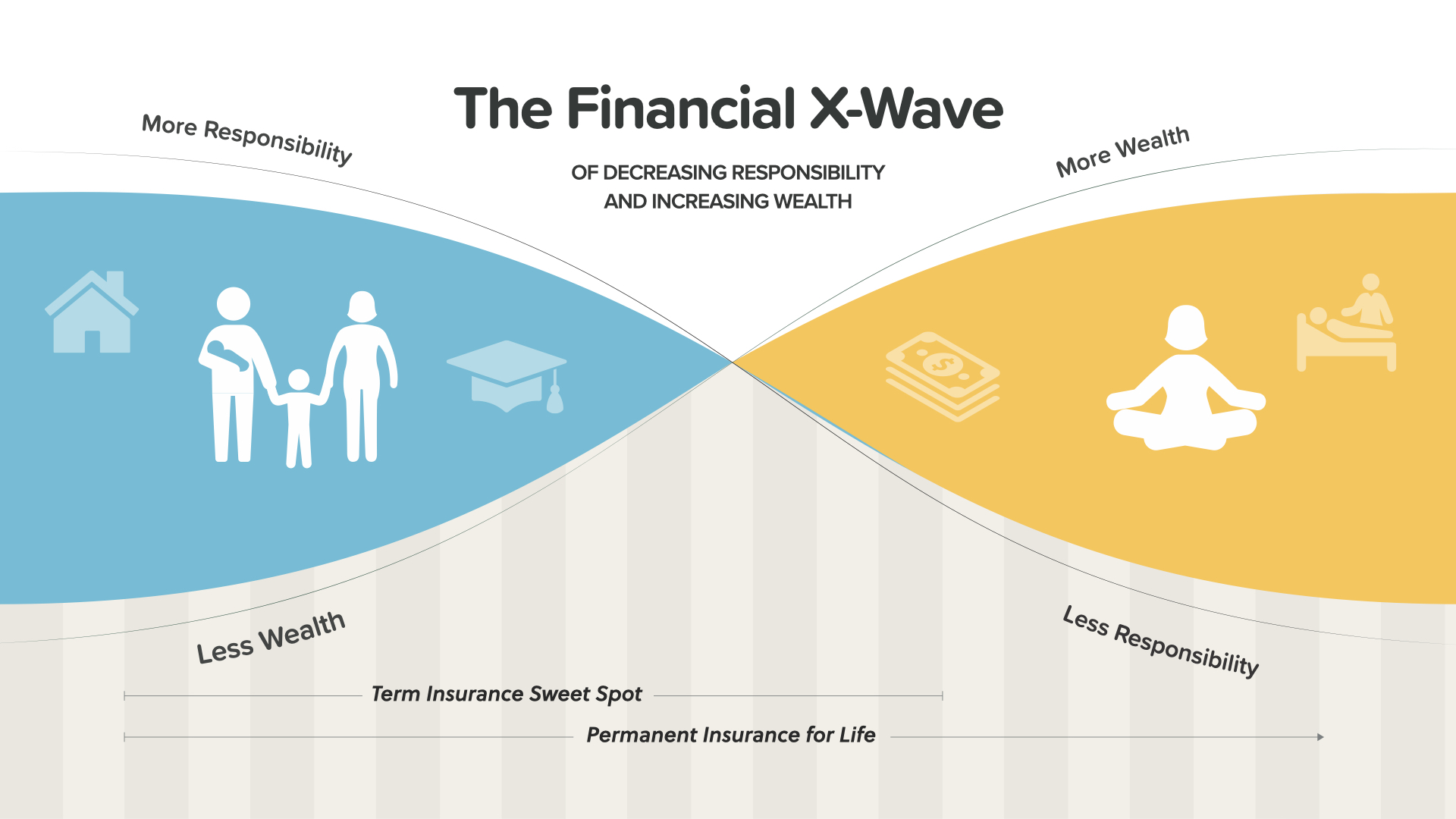 This is what we call “The Financial X-Wave.” In your younger years—represented in the blue on the left—you typically have more responsibility and less accumulated wealth. In your later years—the yellow side—the plan is for your accumulated wealth to increase as your responsibilities hopefully decrease. Term insurance is typically most useful when your responsibilities are higher and wealth is lower—the left side. If these two factors flip later in life as planned, term insurance becomes less practical. Your financial professional can help you look at how the X-Wave could be applied to your situation.