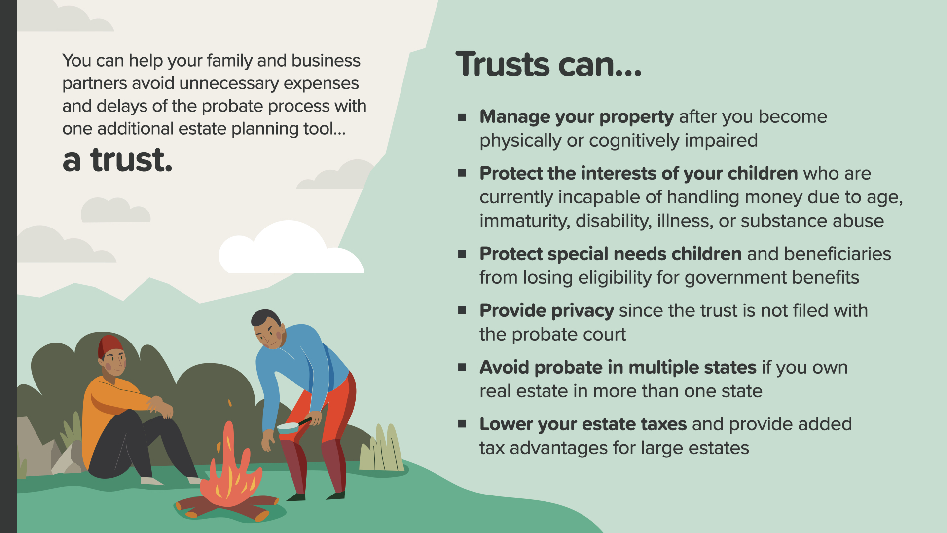 You can also help your family and business partners avoid unnecessary expenses and delays with the probate process with one additional estate planning tool… a trust. Trusts can do many things for you. Again, your legal professional can give you the best advice when it comes to trusts.