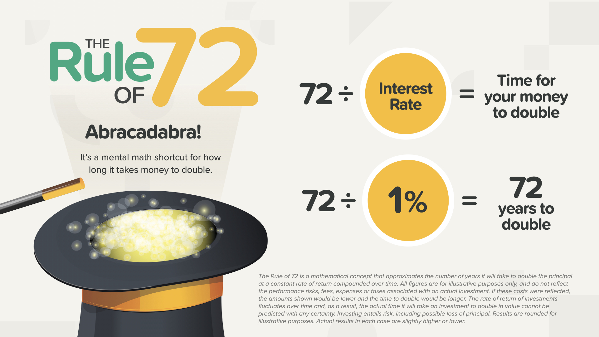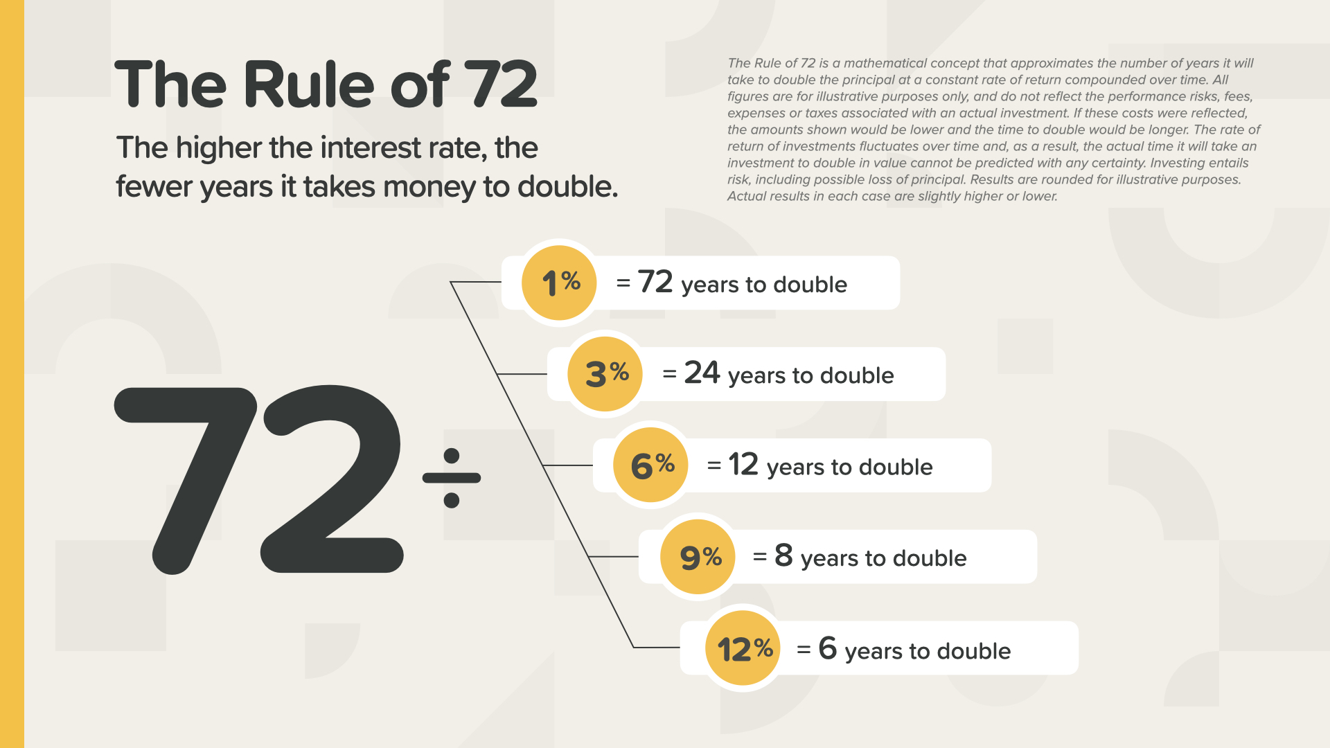 Are you having fun? This is my favorite part. It’s time to learn the Rule of 72. Have any of you ever heard of it before? It’s a little known mental math shortcut that the wealthy have used for years. Everyone should know it. You simply divide any interest rate into the number 72 and it tells you how long it takes for your money to double. It works FOR you if you save money. It works AGAINST you if you borrow money. At 1%, it takes 72 years for $1 to turn into $2. That’s a long time. Would anyone knowingly choose that on purpose? Yet so many people choose rates that low, or even lower.