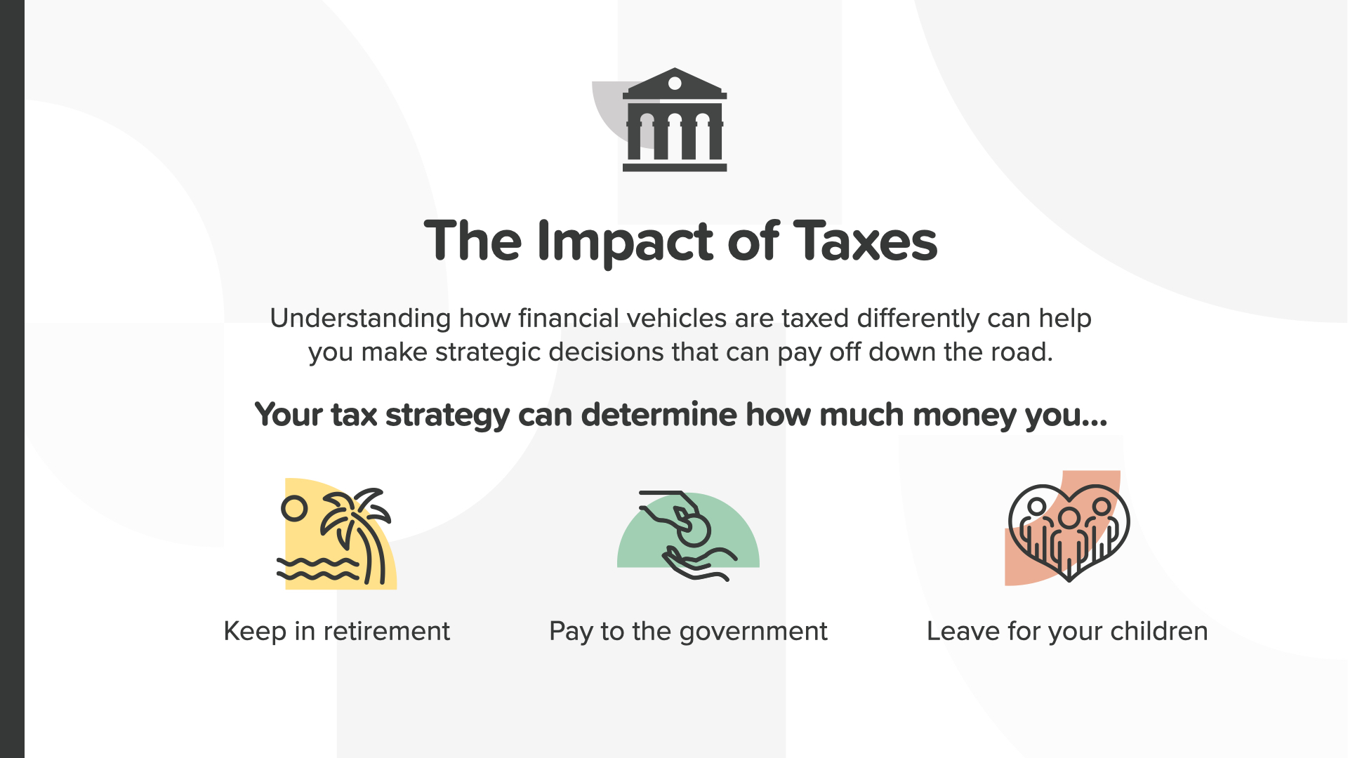 And last, the impact of taxes—the 800 pound gorilla of wealth building threats. Nobody likes paying taxes—especially when you’re preparing for retirement. The tax strategy you put in place today can determine how much money you keep, how much you pay the government, and ultimately how much you leave for your kids. Understanding how financial vehicles are taxed differently can help you make strategic decisions that can pay off big time down the road.