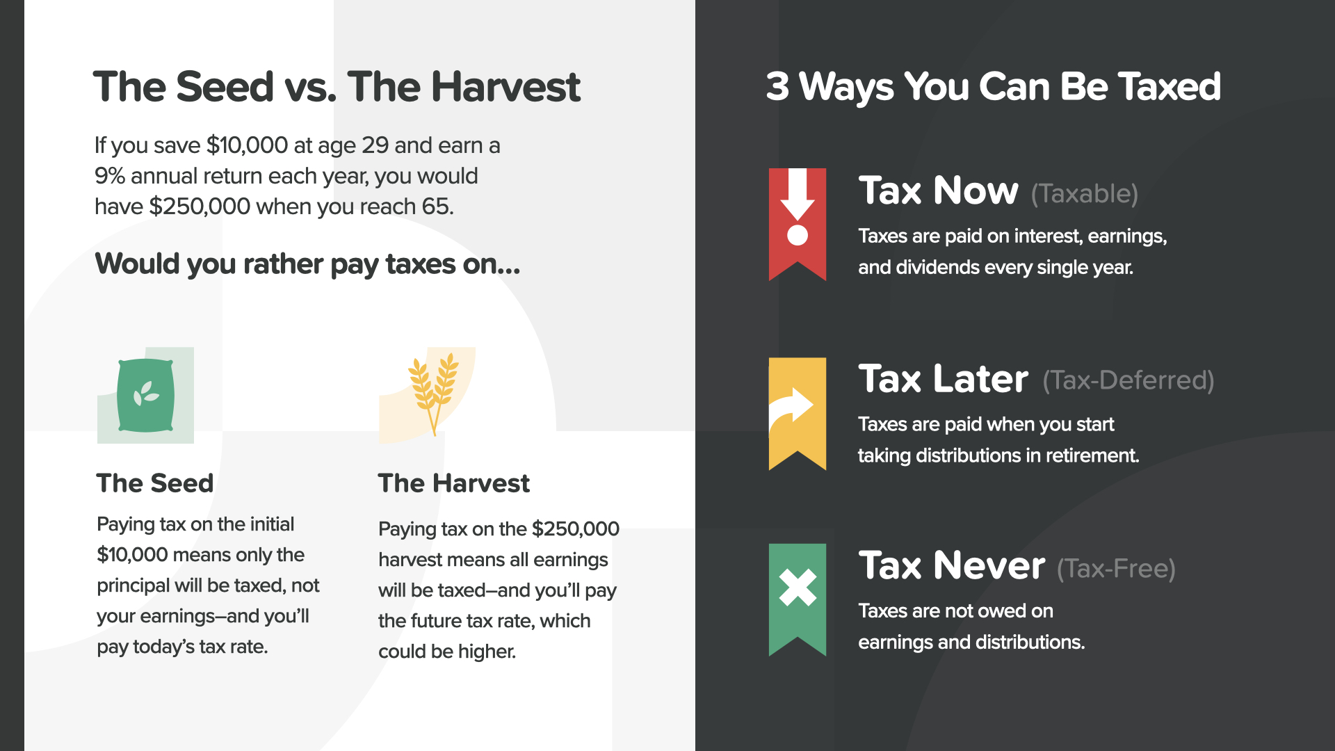 If you save $10,000 at age 29 and earn a 9% annual return each year, you would have $250,000 when you reach 65. Think like a farmer for a second. Would you rather pay taxes on the seed or the harvest? Of course, whichever is smaller—which is usually what you start with. A farmer would rather pay taxes on the seed—not the harvest. An investor would rather pay taxes on the money before it grows, not after. You either pay taxes now, later, or never. Which one will apply to you? It depends on the vehicle you choose. Again, this is where a financial professional can help you.