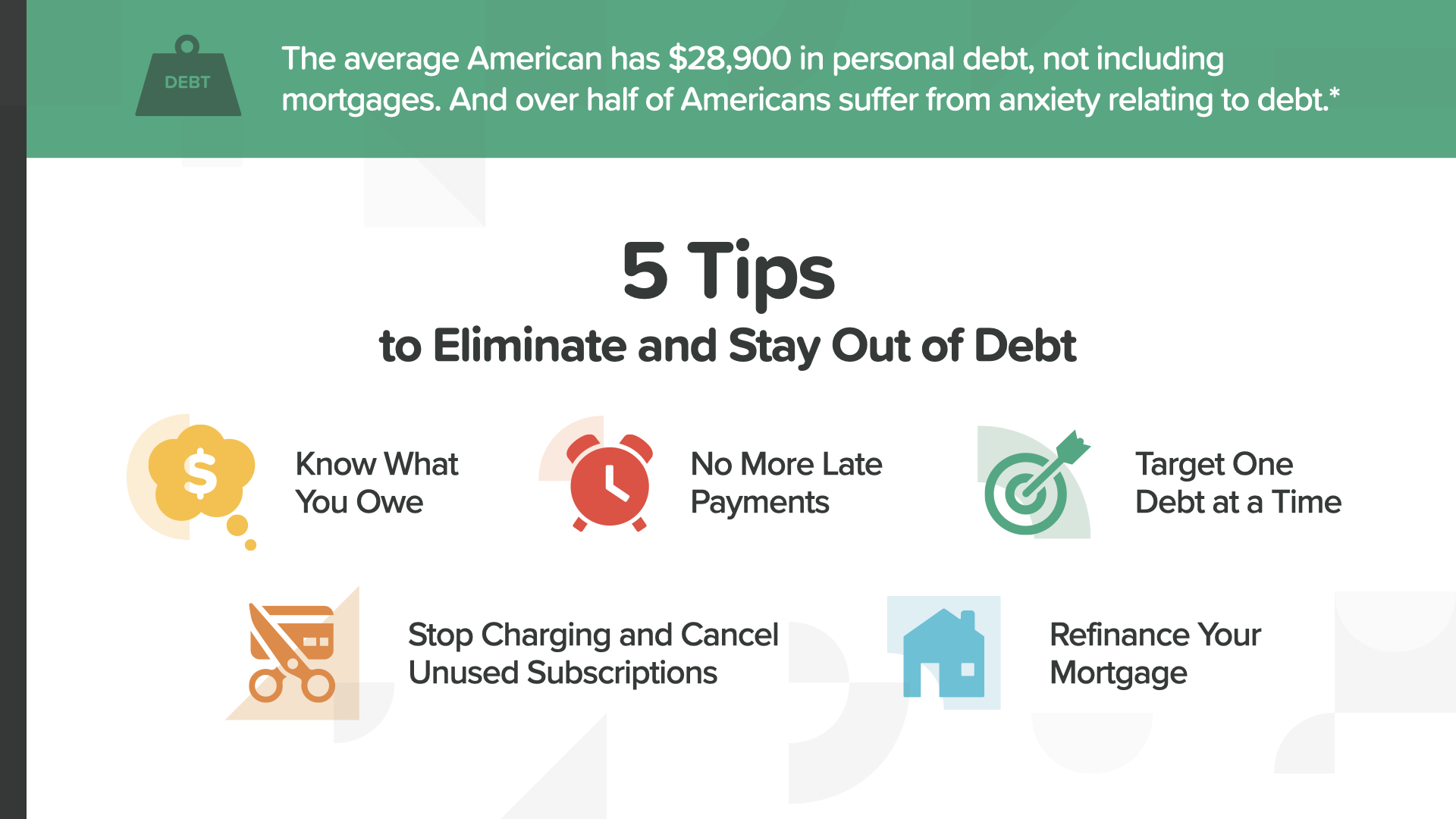 The average American today has $28,900 in personal debt, not including mortgages—and many have much more. And don’t forget over half of Americans suffer from some kind of anxiety relating to debt. When debt is removed, we can enjoy life more fully and more freely. So here are the 5 Tips to Eliminate and Stay Out of Debt… Know What You Owe, No More Late Payments, Go After One Debt at a Time, Stop Charging and Cancel Unused Subscriptions, and consider Refinancing Your Mortgage.