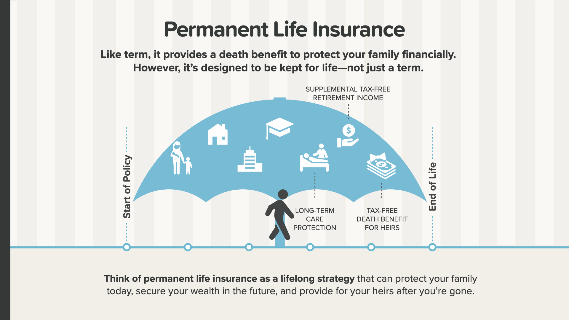 Now, let’s look at permanent life insurance. Like term, it provides a death benefit to protect your family financially; however, permanent insurance is designed to be kept and protect you for your entire life—not just for a limited period. Think of permanent life insurance as a lifelong strategy that can protect your family today, secure your wealth in the future, and provide for your family after you’re gone.