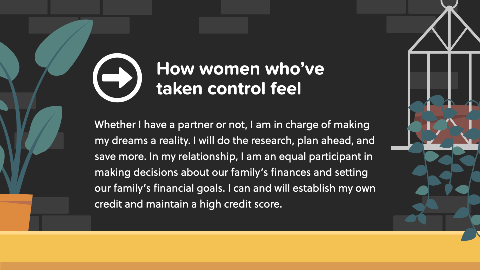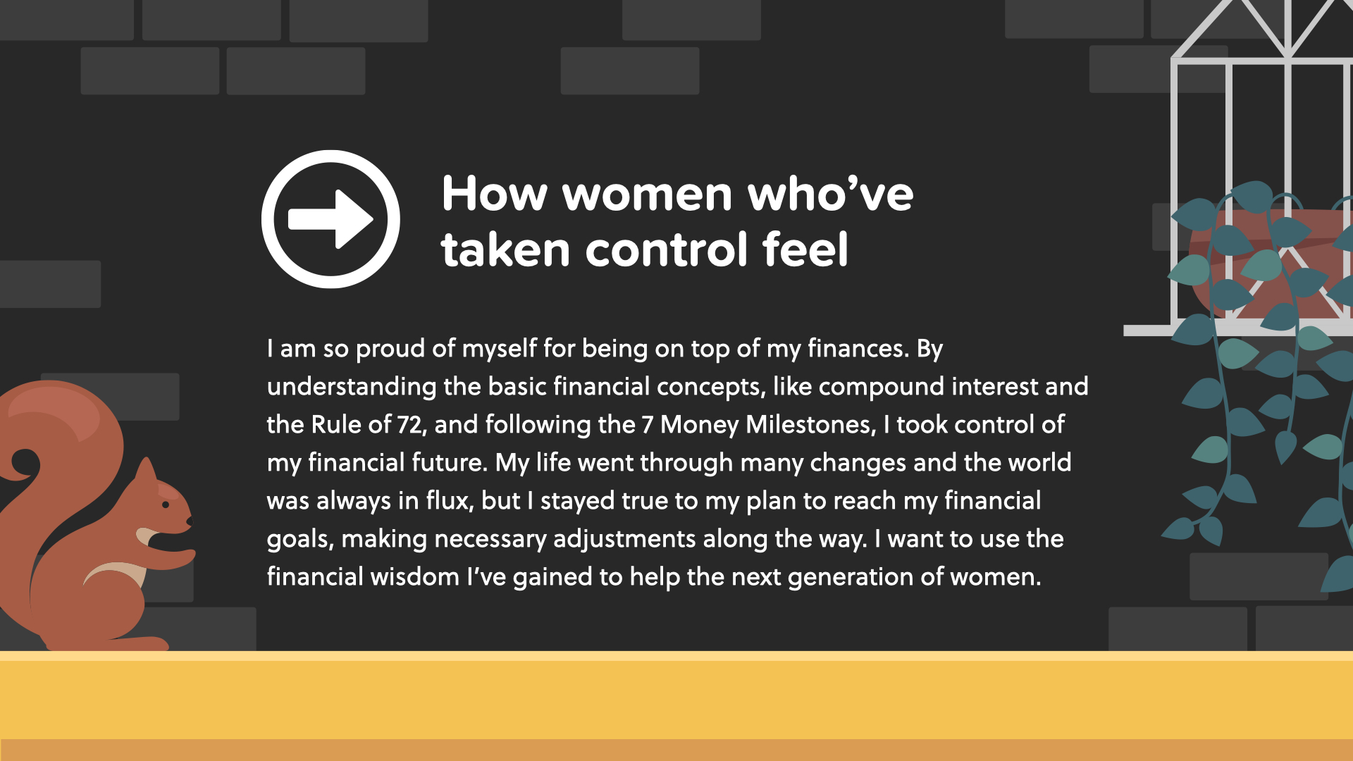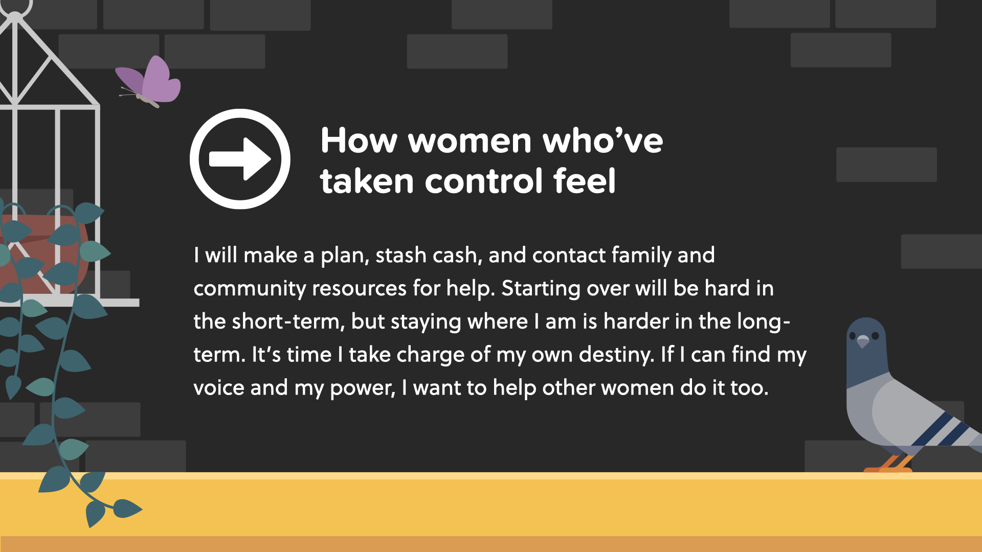 We want women who relate to this chapter to feel hopeful about taking back control by planning, stashing cash, and reaching out for help from family and community resources. Starting over will be hard in the short-term, but staying in the same situation will be much harder in the long-term.