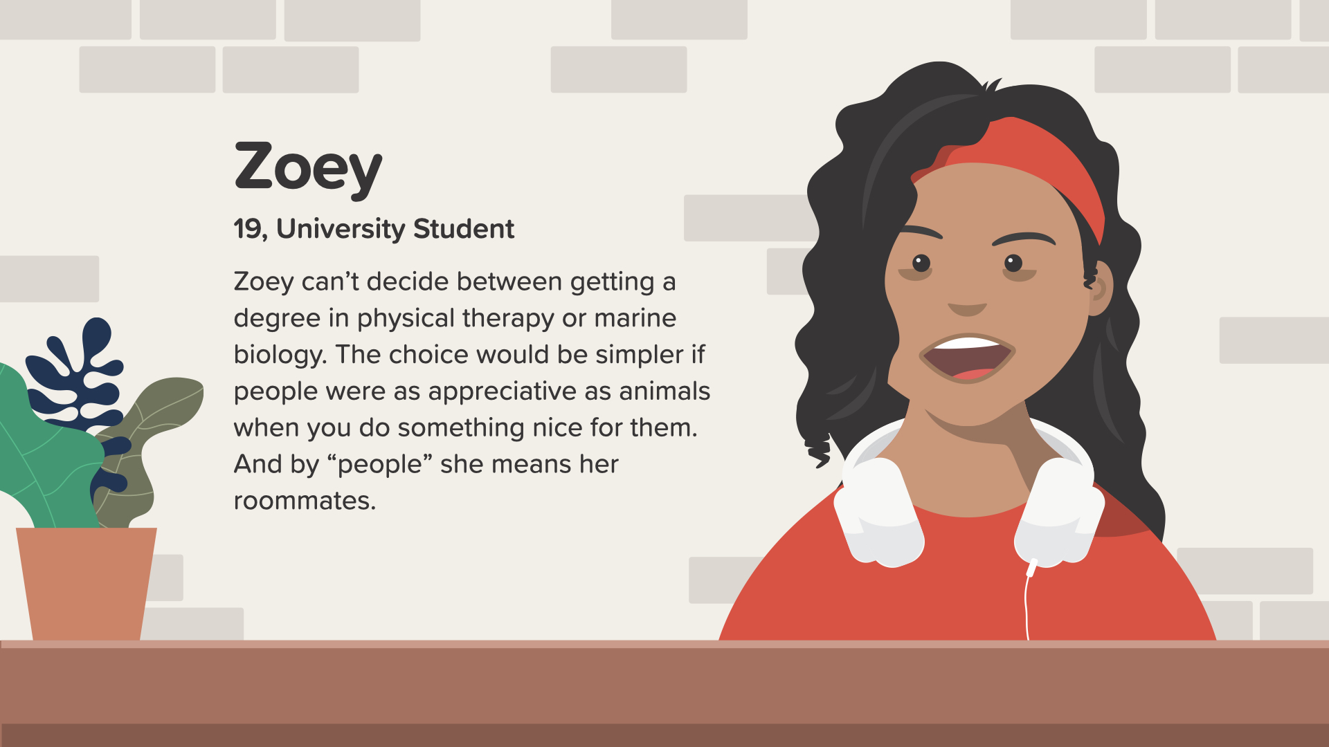 The first character is Zoey. She’s 19 and a college student, so the big financial issue on Zoey’s mind is student loan debt.