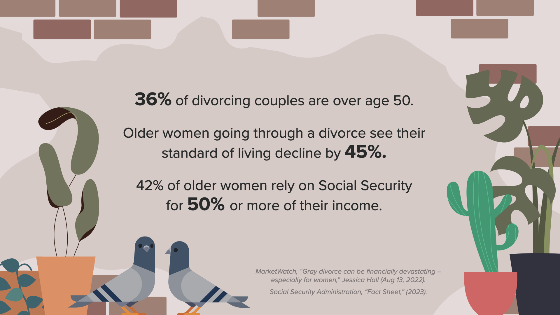 36% of divorcing couples are over age 50. Older women going through a divorce see their standard of living decline by 45%. 42% of older women rely on Social Security for 50% or more of their income.