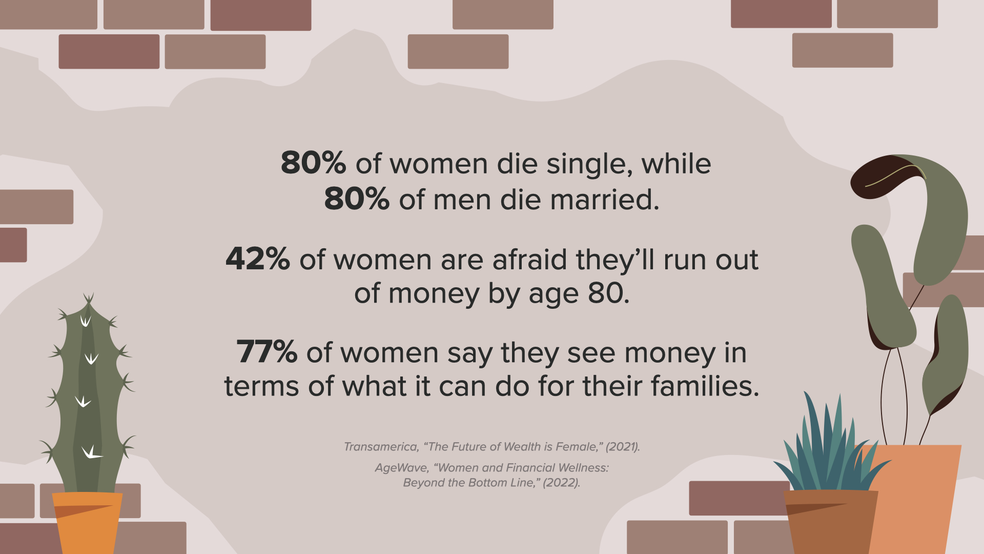Half of married women defer investing and long-term financial decisions to their spouses. There are more than 11 million widowed women in the U.S. today. 51% of widowed women aged 65 and older live on less than $22,000 a year. I don’t know how anyone does that.