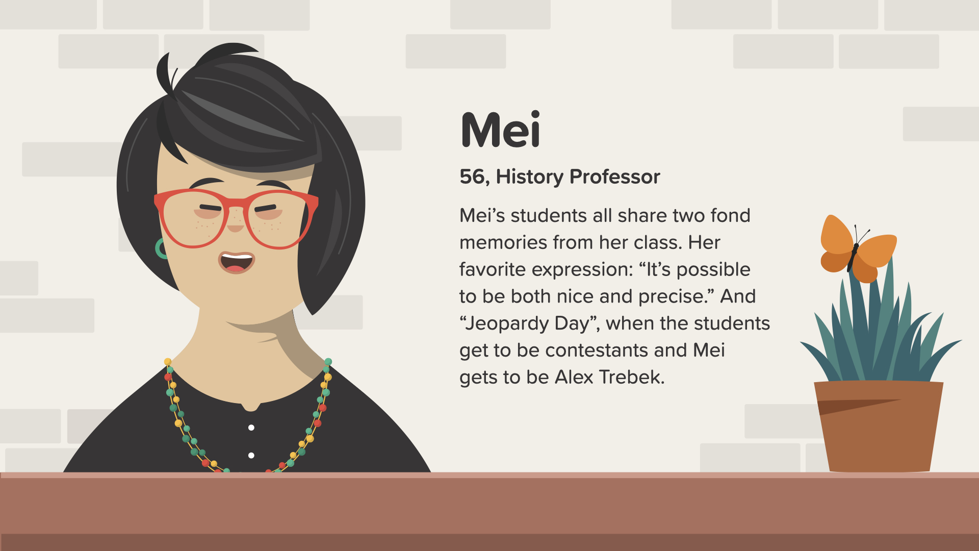 Mei is 56 and a history professor. She finds herself taking care of her aging father and helping her adult son. Both now live with her and she’s looking for how to help take care of her loved ones without compromising her own financial future.