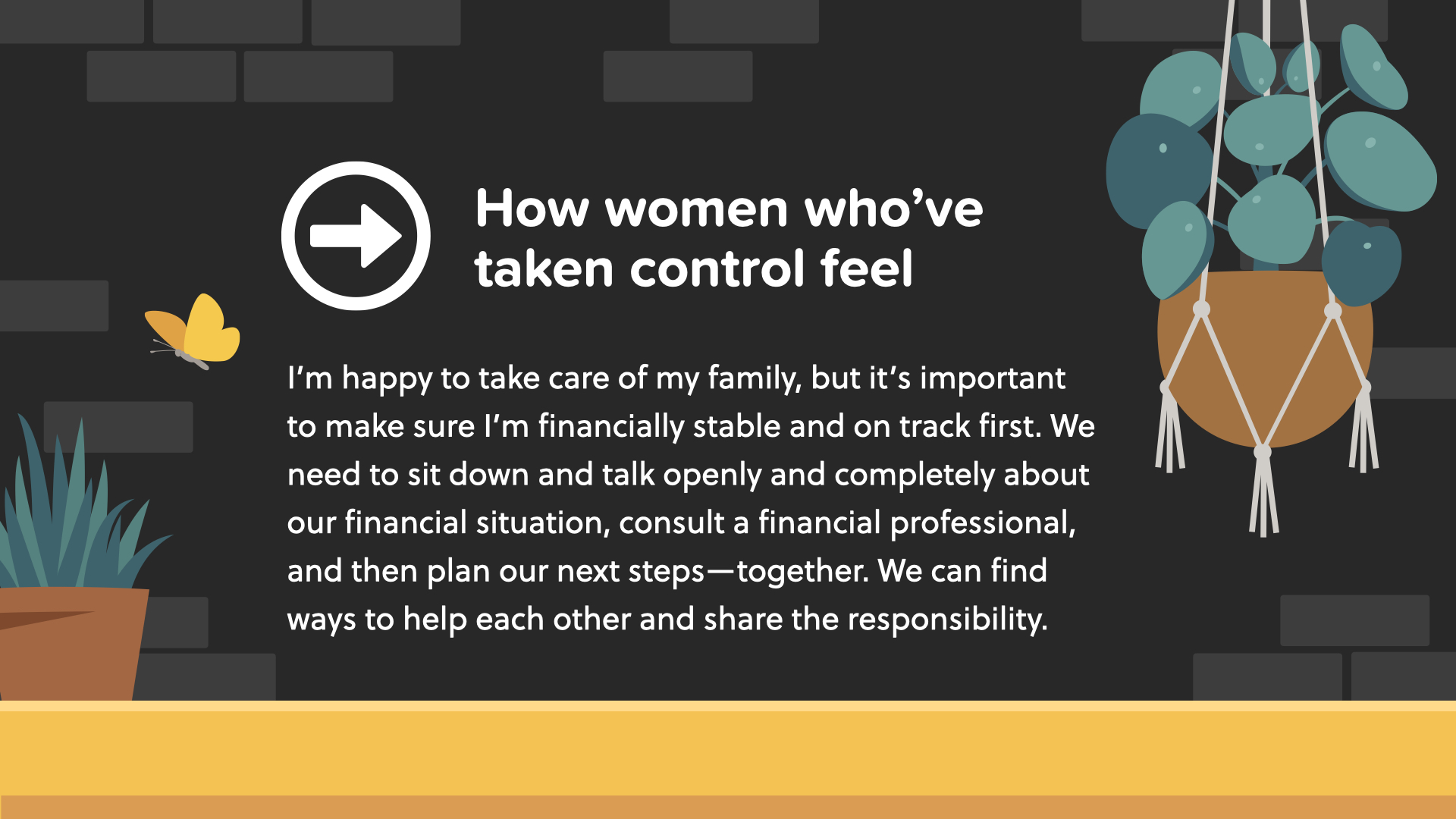 Fatima is 73 and loved being a stay-at-home mom. She left all of the financial decisions to her husband. Unfortunately, her husband recently passed away and Fatima doesn’t know what bills to pay or what investments they have. She doesn’t know where to start, and when she asks her husband’s financial professional, he just tells her she’ll be okay without explaining anything.