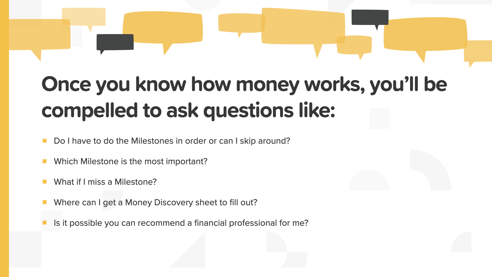 We’re at the conclusion of today’s session. Learning about the Milestones will bring up questions like the ones you see on the screen here. A financial professional is the best person to turn to for answers. I can discuss finding one if you don’t have one already or need help choosing one. Sharing financial literacy and education is what we do! Thank you for your time and attention and I wish you all the best in your financial future. If you have any questions, just let me know!