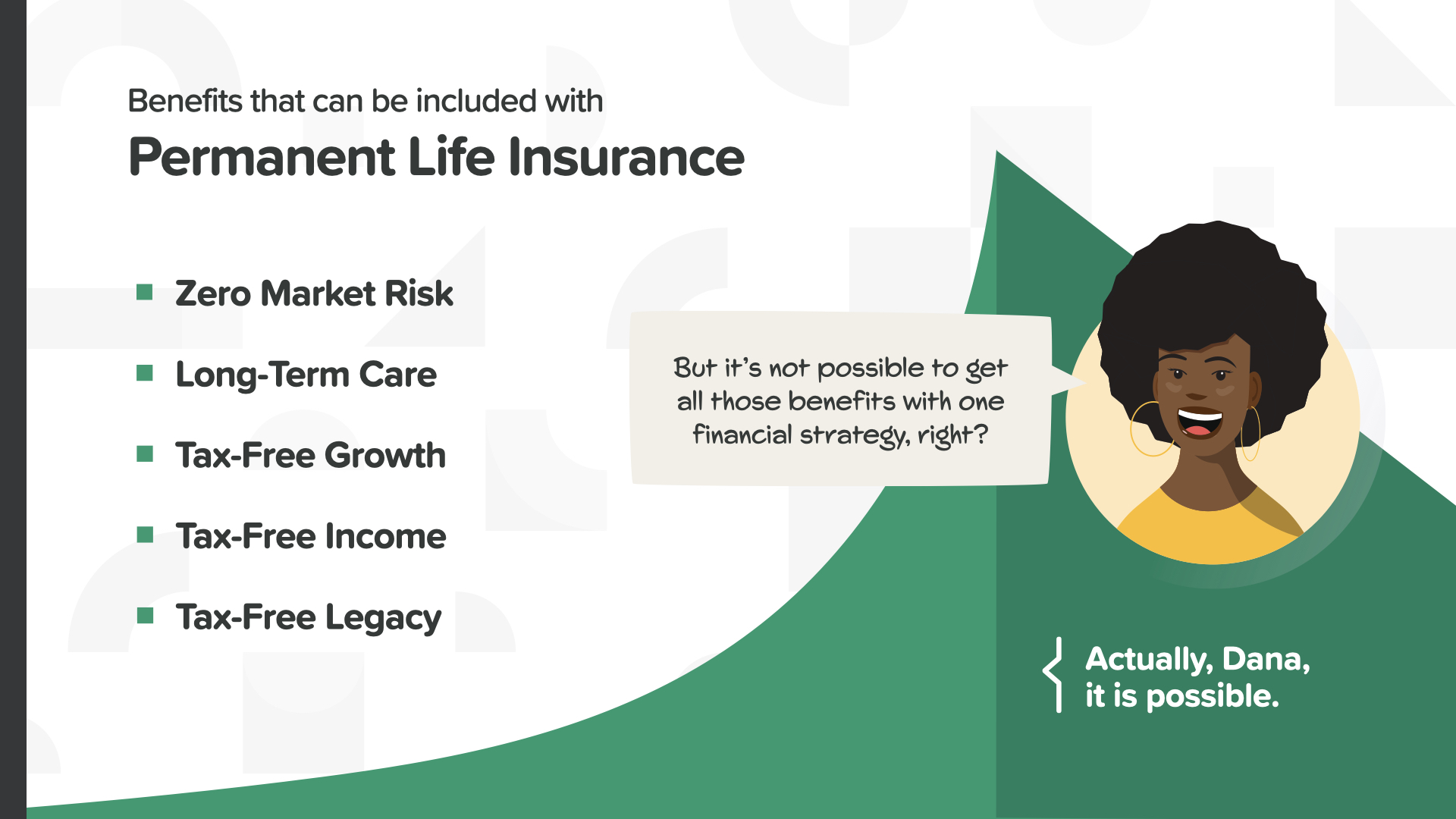 There are 3 important benefits of permanent life insurance. Number one is life insurance protection for your entire life. Two—with many permanent life policies, you can add long-term care as an optional rider. And number three is your accumulated cash value, which can give you flexibility with premiums (this means if you ever can’t pay your premiums for some reason, they can be paid out of your cash value).