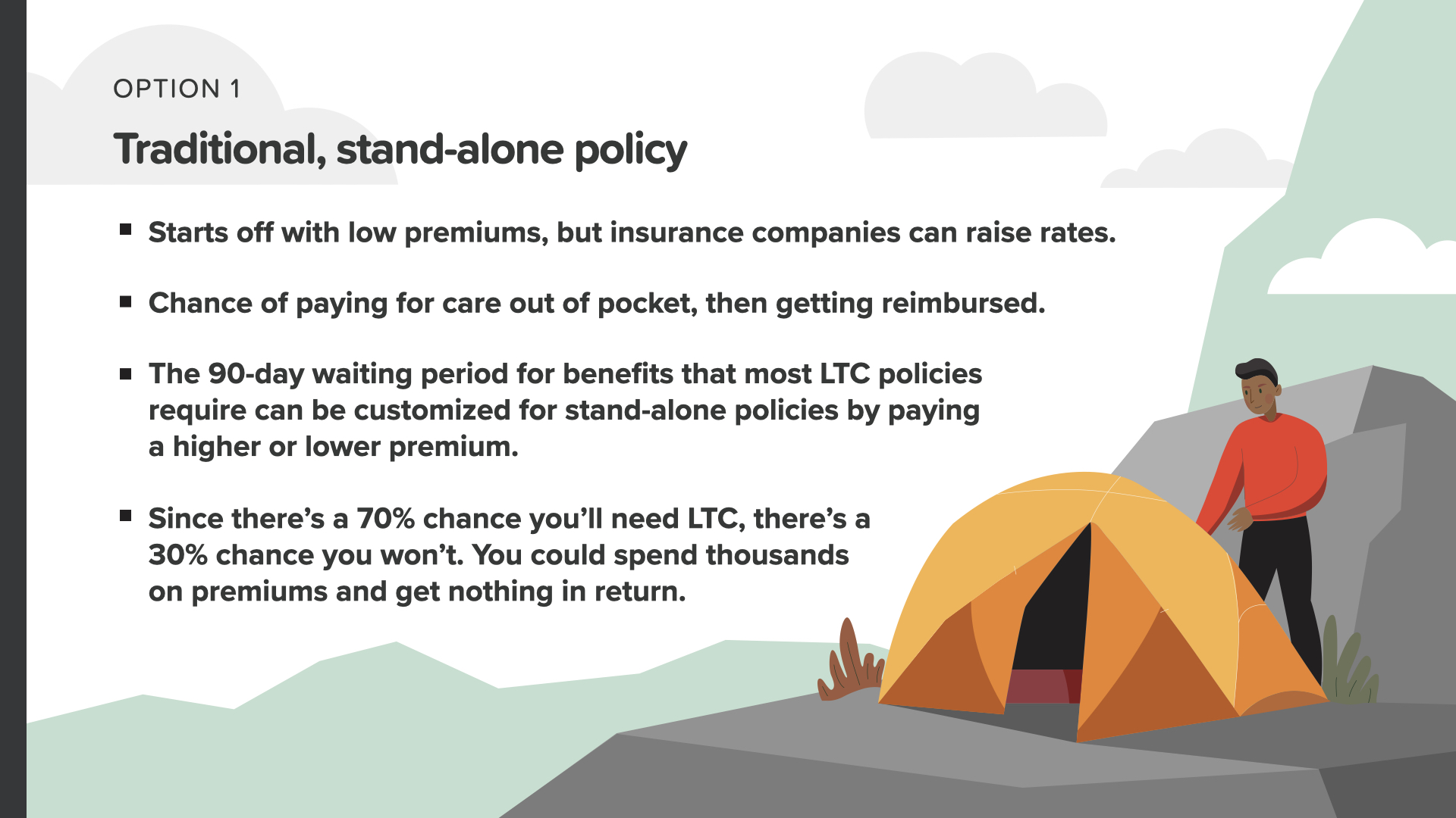 If you go with Option 1 and buy a traditional, stand-alone policy, there are a few things you should know—like the fact that premiums start low, but insurance companies can raise rates on them. Also, you usually pay for care up front out of your own pocket, then get reimbursed–which can be seen as an inconvenience during a difficult time. Another thing to keep in mind with the stand-alone option is that you could spend thousands on premiums and get nothing back in return. Although there’s a 70% chance you’ll need LTC, there’s also a 30% chance you won’t.