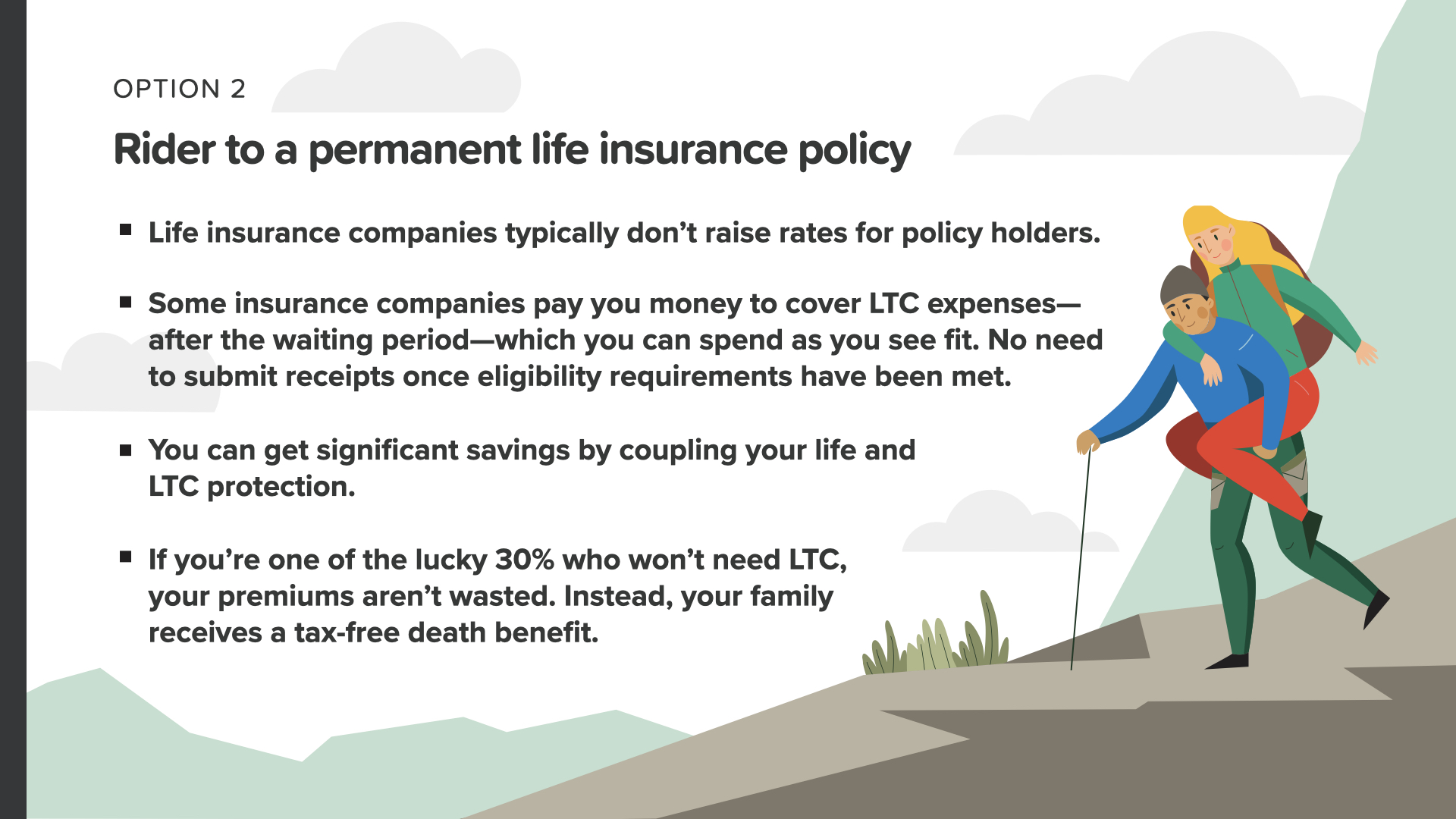 Or you can go with Option 2 and choose to add a long-term care rider to a permanent life insurance policy. A key advantage of this option is that life insurance companies typically don’t raise rates for life insurance policyholders. Some insurance companies—after a waiting period—pay you money to cover LTC expenses which you can spend however you see fit. No need to submit receipts once the eligibility requirements have been met. Coupling your life and LTC protection can equal a big savings. If you’re one of the lucky 30% who ends up not needing LTC, your premiums aren’t wasted. Instead, your family receives a larger tax-free death benefit.