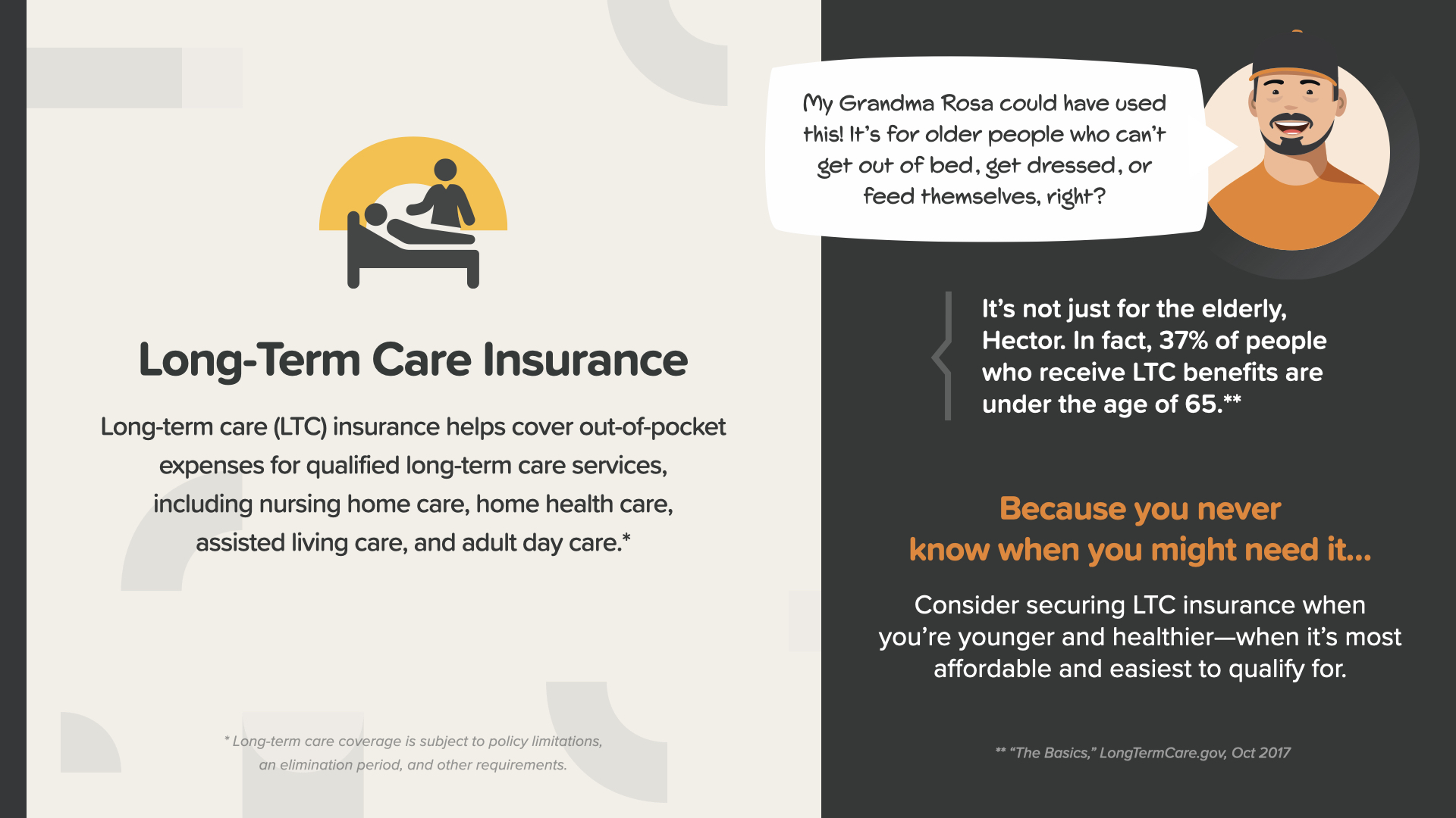 Long-term care (LTC) insurance helps cover out-of-pocket expenses that can really add up. It can be used to pay for qualified services like nursing home care, home health care, assisted living care, or adult day care. And you never know if—OR WHEN—you might need it.