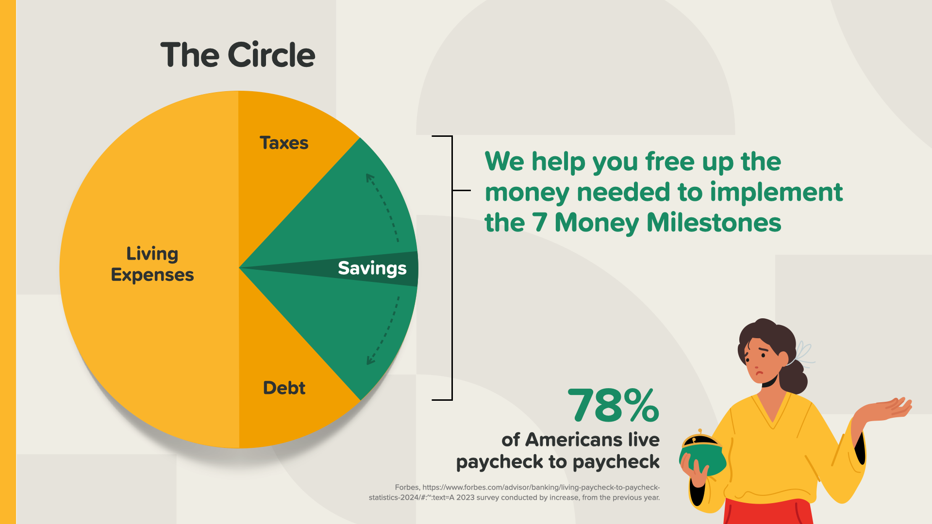 Here’s a picture we call The Circle. It shows where your money goes today. As you’ve heard, many Americans are living paycheck to paycheck. Our goal is to help our clients increase their savings by looking closely at things like their living expenses, taxes and debt. We recommend freeing up money to improve how the milestones can work for you.