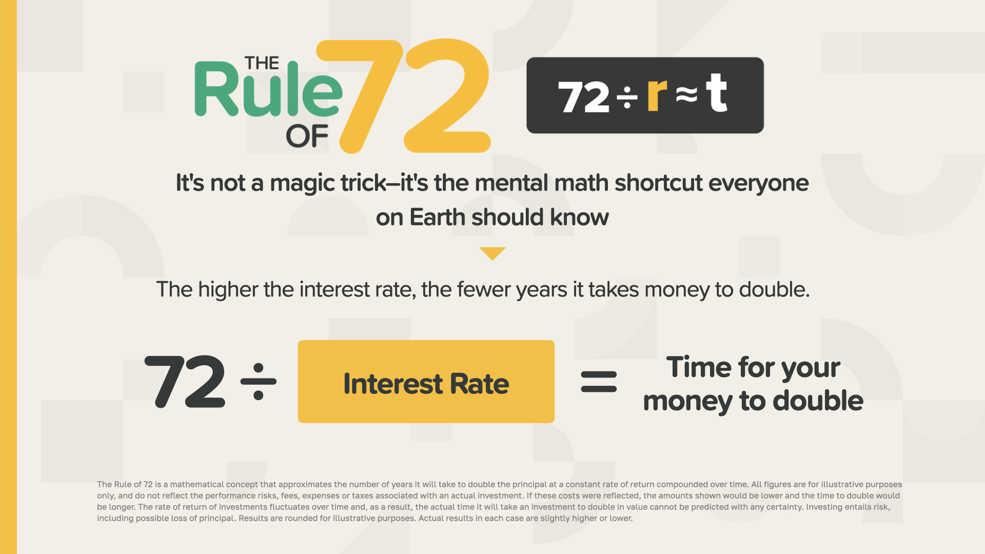 Have you heard of the Rule of 72? When I first learned about it, I realized I wanted to turn this business into my career. Growing up, I was always taught to work hard, get good grades, graduate with honors, and then spend 30 years at a big company before retiring with a gold watch and a pension. Today, there has been a shift to personal responsibility. But no one ever taught you how to make money and time work for you and your family. Understanding the equation here is one thing; knowing how to make it work in your favor is another. The Rule of 72 is a straightforward mathematical formula that helps you quickly estimate how long it will take for your money to double based on an interest rate. The principle is simple: the higher the interest rate, the faster your money can double. This rule benefits you when you’re saving and works against you when you borrow.