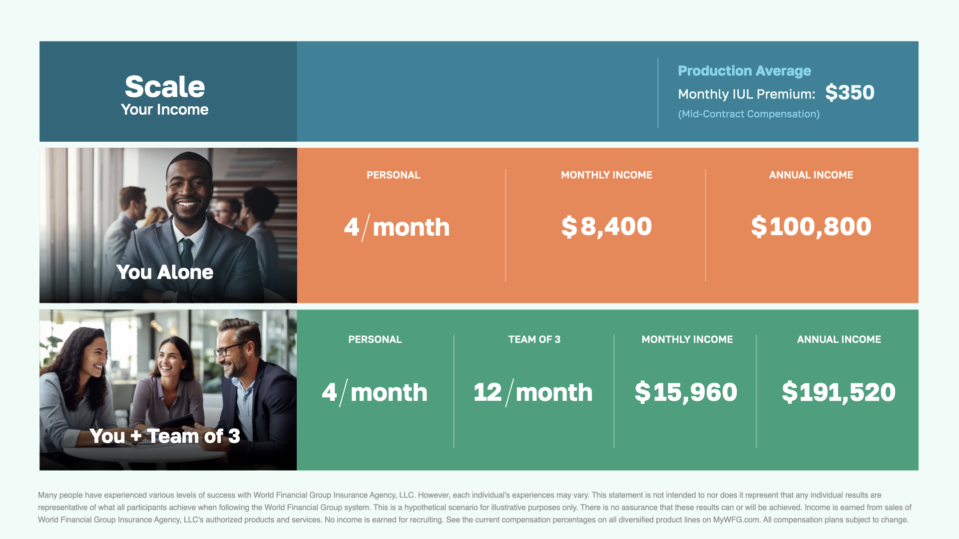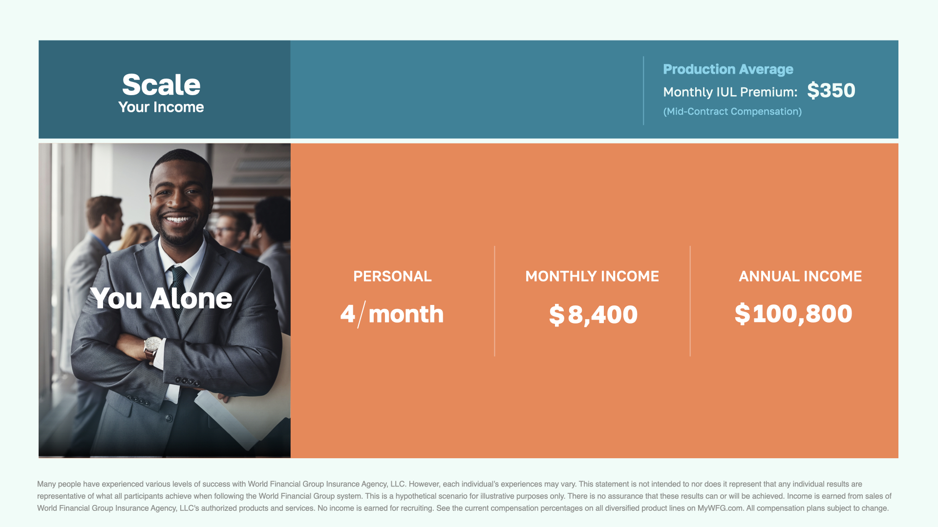 This illustrates the income potential of our business model. For example, if you assist one client each week with just one of our products, this could translate into a six-figure annual income for you.