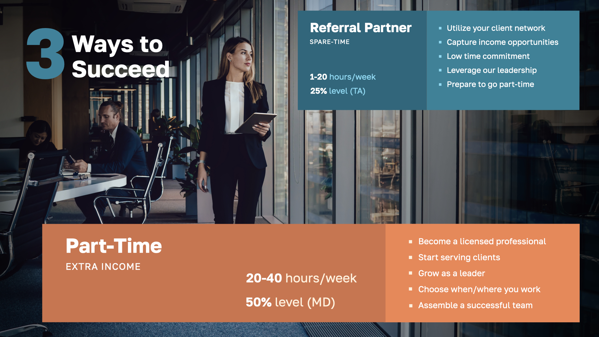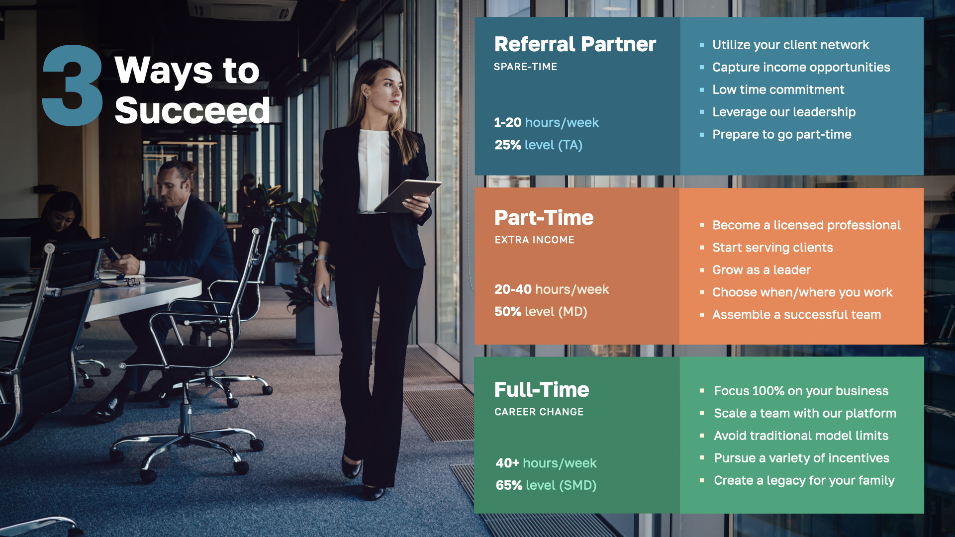 Part Time: As you advance, you transition to setting higher income goals, investing more time and effort with clients, and starting to build your team. This stage enables new leaders to try out this business without the need to quit their full-time jobs, making it accessible even if they are unsure about the industry.