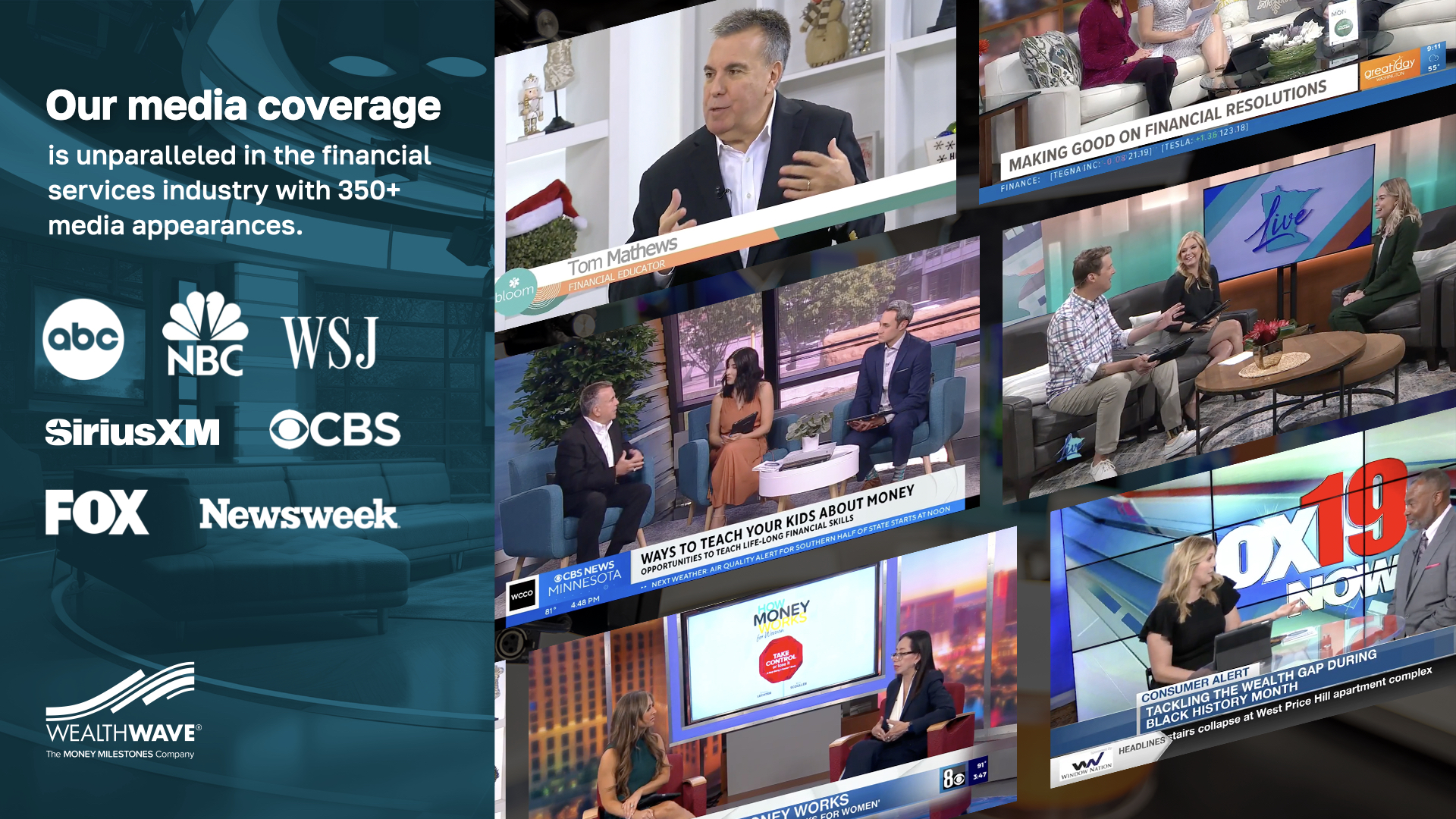 Good morning/afternoon/evening. We're WealthWave, The Money Milestones Company. You might have heard of us. We’ve reached millions through our TV appearances, being featured in the media over 350 times in the past five years. Before exploring the specifics of our firm, I’d like to share my personal story to help you get to know us better. [Share your 2-3 minute personal story.]