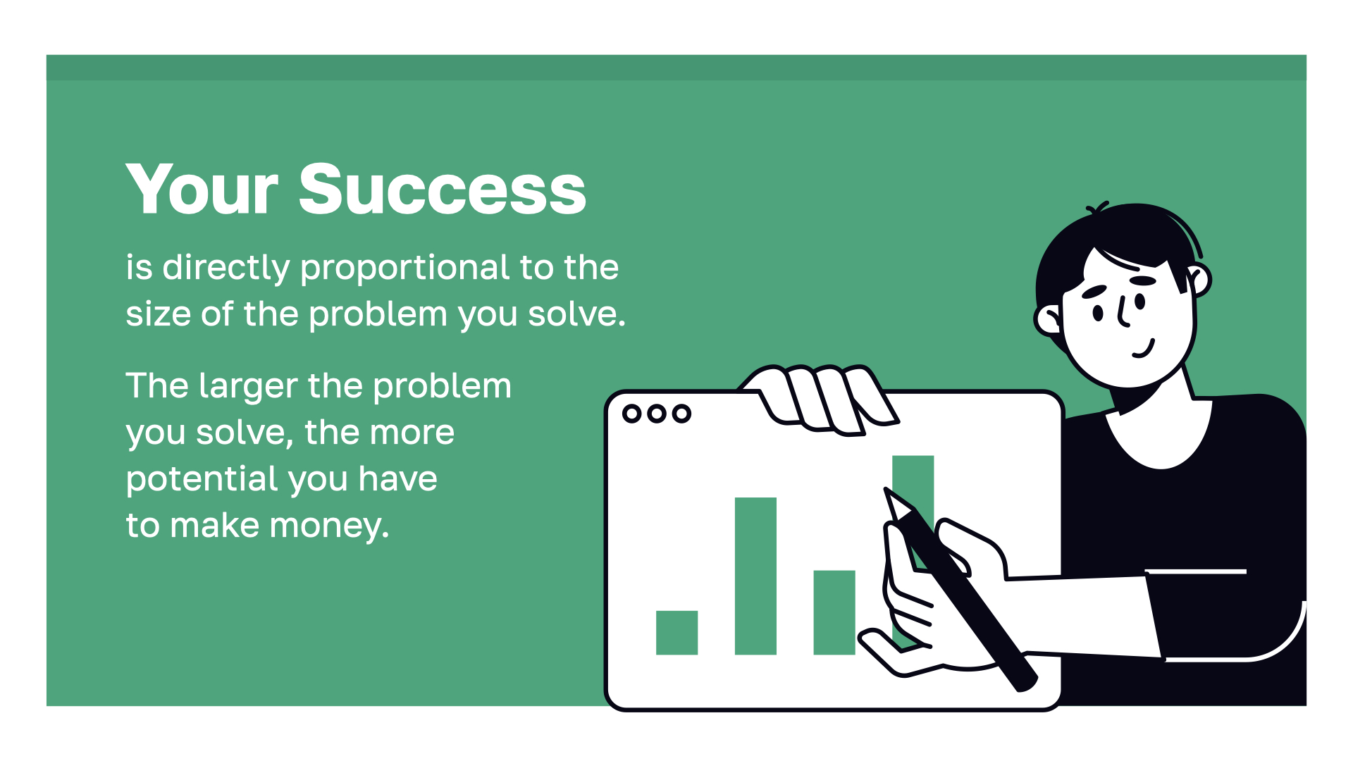 Let’s begin with the basics. Your success as a business owner is directly proportional to the size of the problem you solve. It makes sense! When you tackle a large problem that affects a lot of people, you have the chance for greater success than if you fix a small problem that only impacts a few people. Greater success enables you to solve even greater problems.