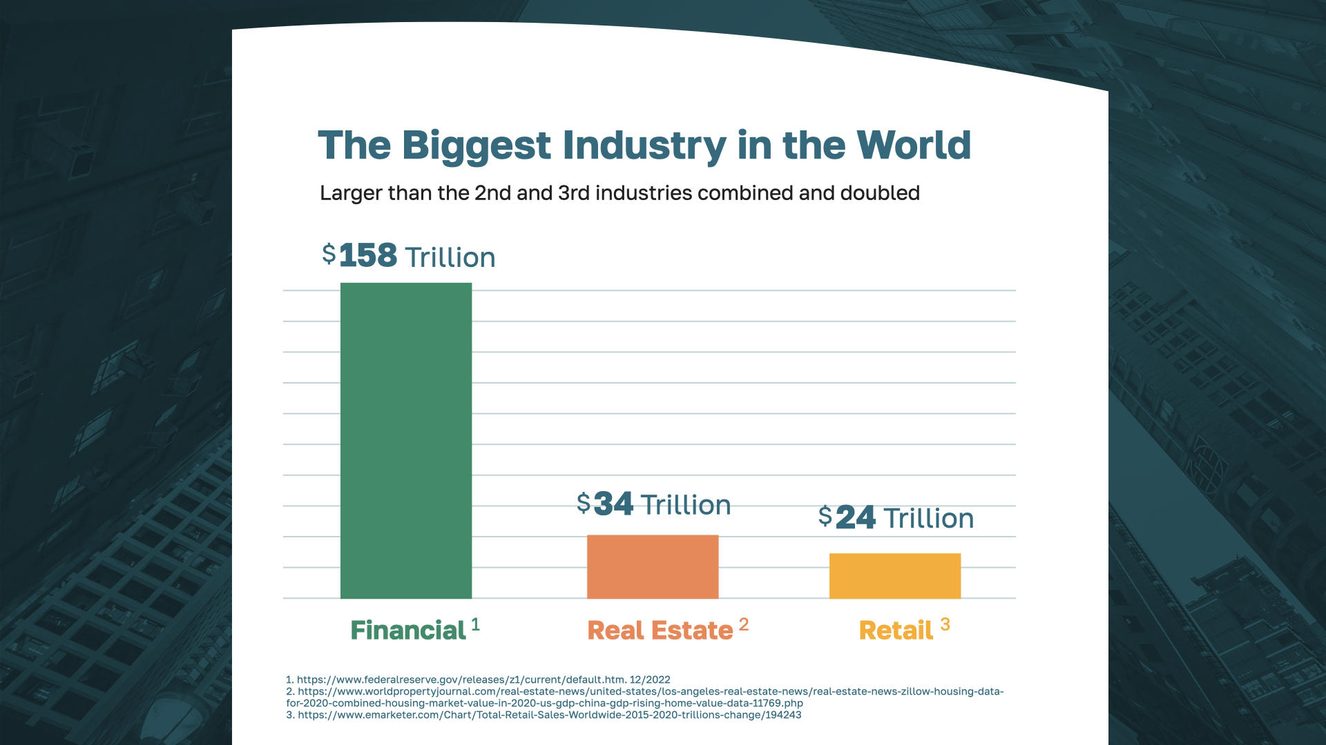 If you want to solve a big problem, become part of a big industry. The financial industry is the largest industry in the world, standing at $158 trillion. That’s larger than the next two industries combined and then doubled. And it’s growing quickly! In fact, it’s the fastest growing post-pandemic industry.