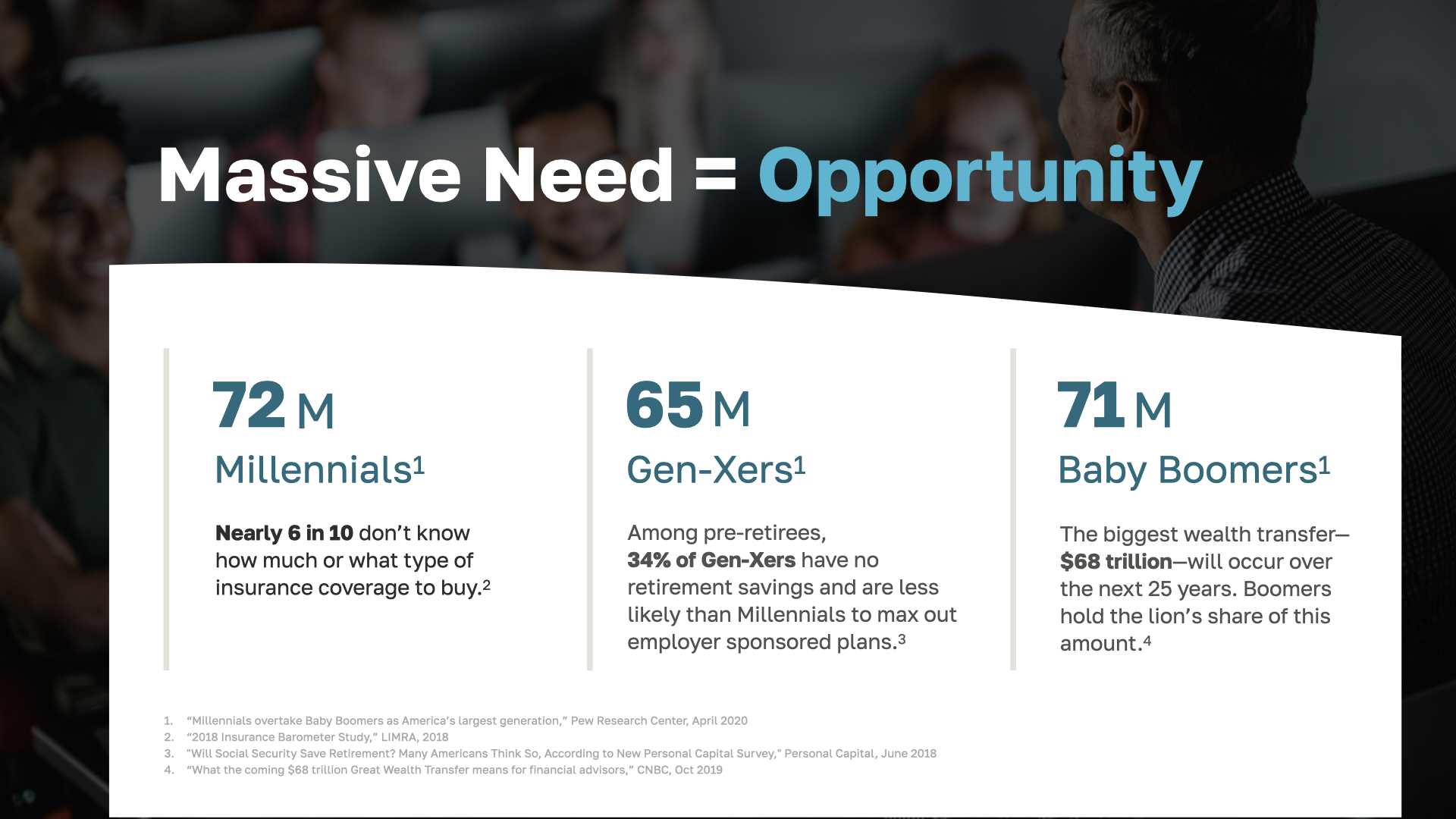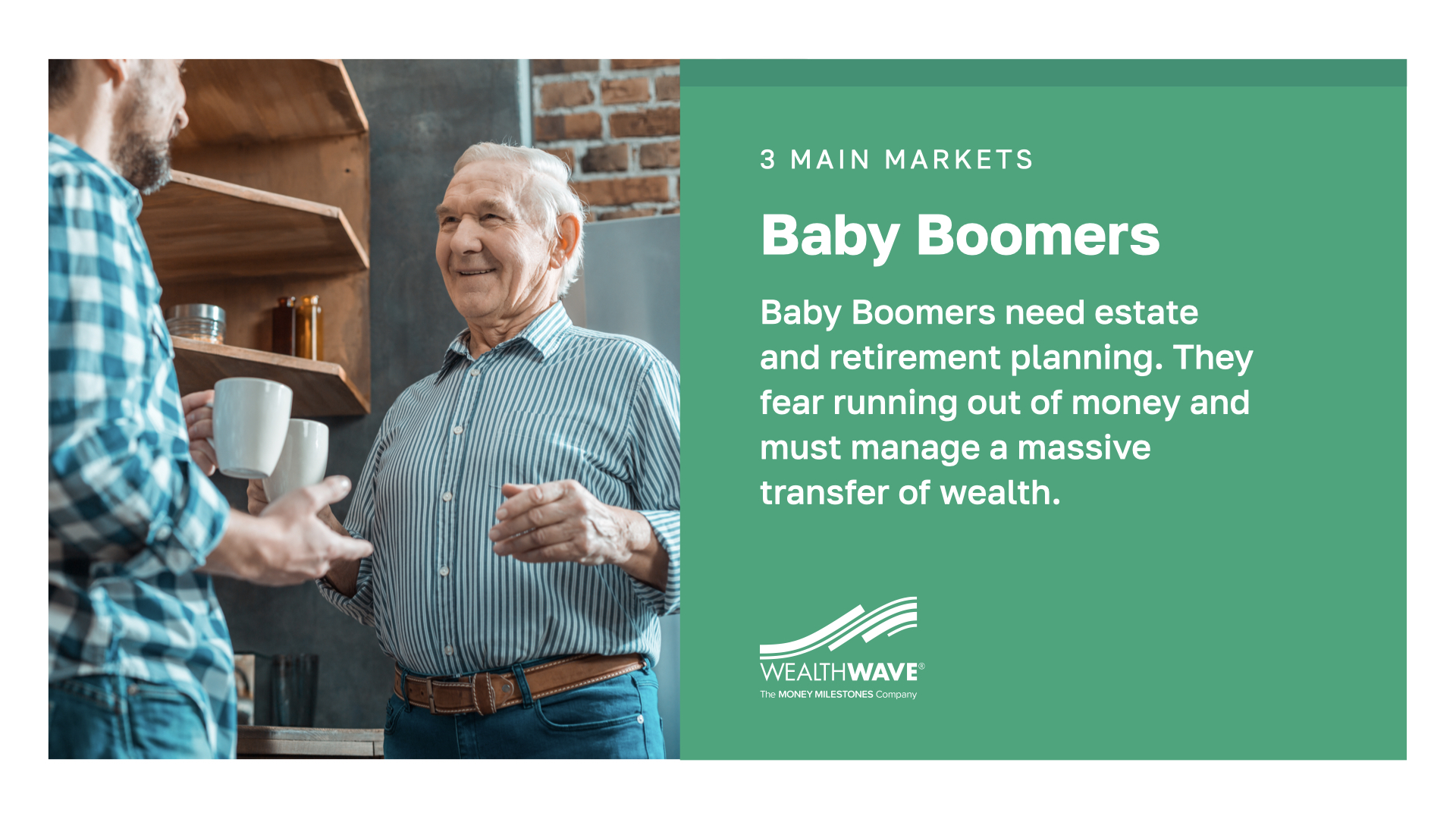 We’ve identified three main markets that the financial industry can help solve problems for. The first is Baby Boomers. Famous for the size of their generation and now facing retirement, Boomers need guidance as they unravel how to afford retirement and pass their wealth on to their children. Many still need a basic education about how money works.