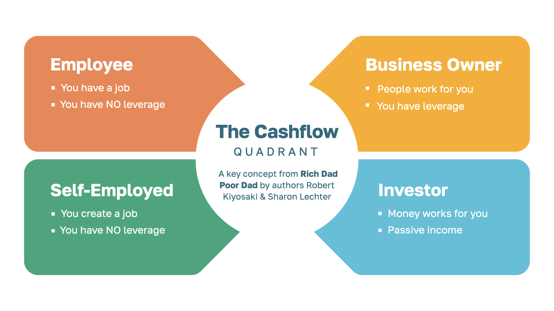 The Cashflow Quadrant, a key concept from Rich Dad Poor Dad by authors Robert Kiyosaki & Sharon Lechter, highlights these differences. Employees and the self-employed all trade their time for money. There’s still earning potential there—just ask a doctor or lawyer who works 80 hours a week—but it will never be UNLIMITED earning potential. Only a business owner has the power to leverage a team to create income. And once you’ve reached that point in the Cashflow Quadrant, you can then make your money start working for you by becoming an INVESTOR!