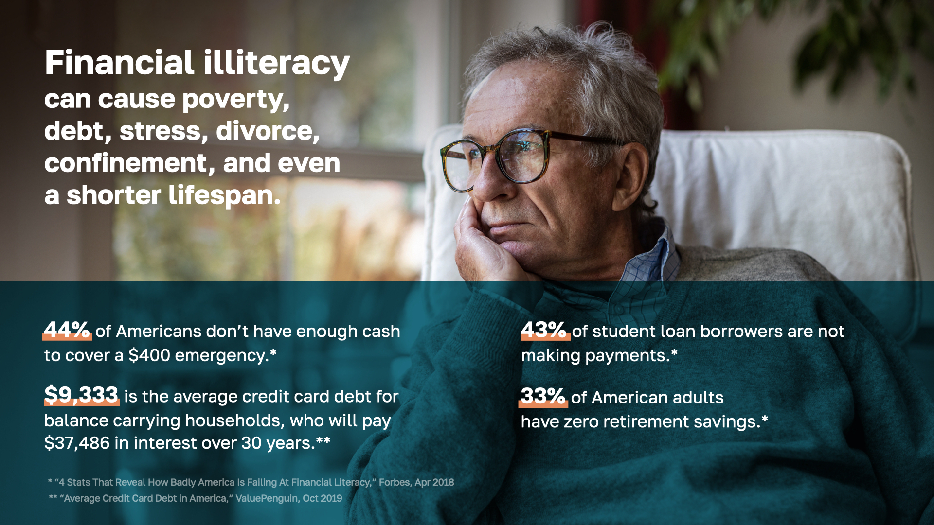 Financial illiteracy is a crisis because it creates widespread poverty, debt, stress, divorce, financial confinement—AND a shorter life span. Look at these unbelievable stats: 44% of Americans don’t have enough cash to cover a $400 emergency. 43% of student loan borrowers are not making payments. $9,333 is the average credit card debt for balance carrying households, who will pay $37,486 in interest over 30 years. 33% of American adults have zero retirement savings. The damage caused by not knowing how money works is clear—and it’s why we’re committed to educating people—to break that cycle.