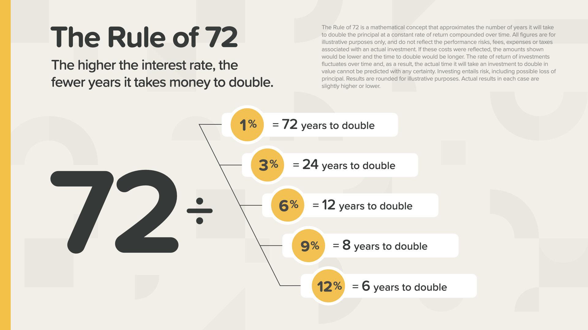 For example… If the money in an account is earning a 1% rate of return, how long will it take your money to double? That’s right—way too long! But look what happens at 9 or 12%.