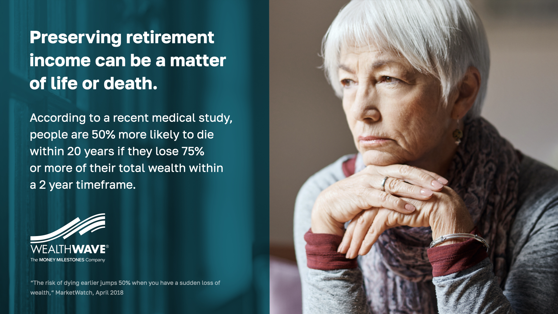 Our second strategy KEEPS the wings on your retirement plane by providing a reliable income stream you can’t outlive. And statistically, we know that’s important. A recent medical study shows that people age 50 and older who take a major loss on their portfolio have a 50% higher chance of dying in the next 20 years than people who don’t! INCREDIBLE. Why do you think that is? Stress. Depression. Yes. And possibly not having enough money for proper medical care or quality nutrition. To me that’s a tragic pandemic—not viral but financial. If you’ve ever been stressed about money, you understand.