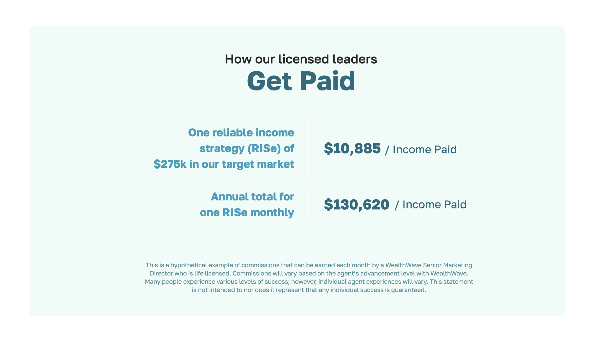 So let’s talk about how we’re compensated. Here’s an example. As an entry level, full-contract leader with WealthWave, you could earn around $10,000 per month when you help just one average Baby Boomer in our target market with the RISe strategy. How many do you have to help to make good money? Most people say one, but if you help just 2-3 average Baby Boomers per month in our target market, your annual earning potential would be around $250,000. That’s good money.