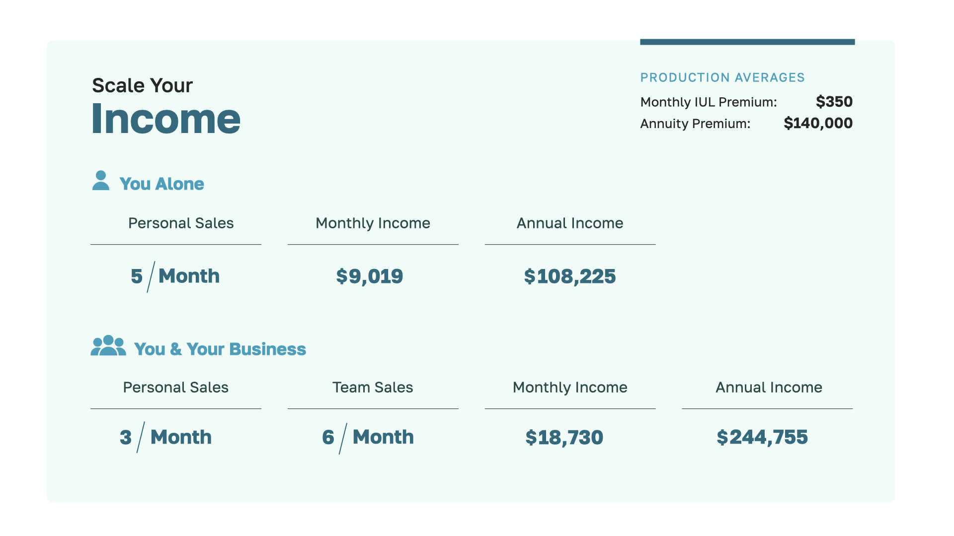 What about when you help clients set up a TenNIS—a “Tax-Never Income Strategy,”—like we discussed earlier? If you help just 5 clients per month, you’d be in the six-figure range. To more than double your income, you can drop the number of families you personally help to 3 and then build a small team that helps an additional 6 clients—that’s just 9 total sales from you and your business each month. Now, you’re in the $250,000 range. That’s on top of the money you’re making helping people with the RISe strategies. What I’ve just presented is a realistic path to a half million dollar annual income. And because WealthWave is a scalable business, the only limitation on your income is your ambition and your goals.