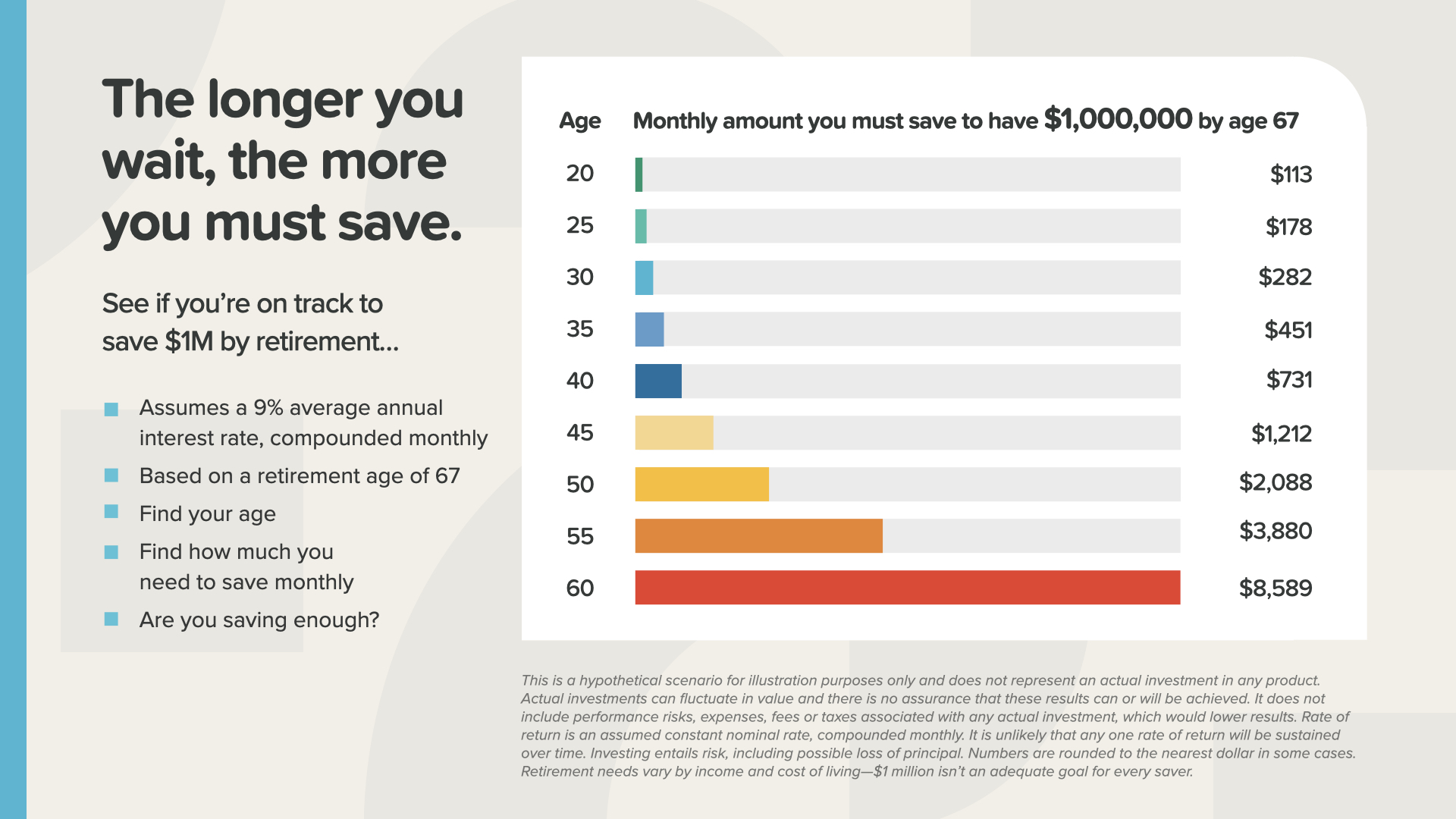 Waiting to start saving can cost you a fortune—or at least require that you save one. In this chart, you can see how much you need to save each month to have $1 million by retirement (assuming a 9% rate of return). At 20 years old, you only need to save $113 per month. At 40, it jumps to $731. And at 60—the long red bar at the bottom—you’d have to save $8,589 every month. This graph reveals how serious it is that we teach people the Time Value of Money—that EVERY day counts!