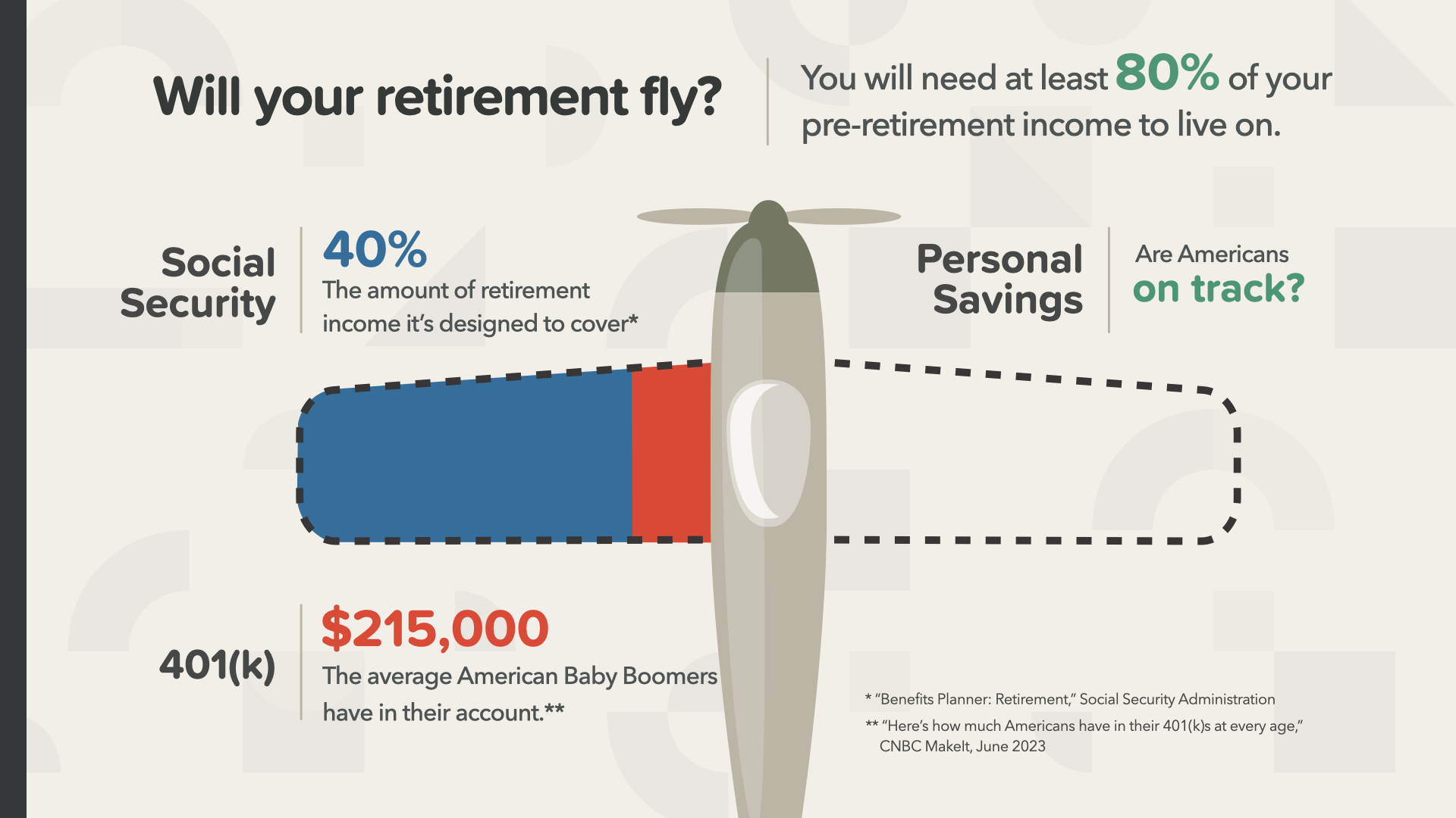 By the way, how much of a pay cut do you want to take when YOU retire? Experts say we’ll need about 80% of our peak income to live comfortably. Let’s imagine someone caps out at $100,000 per year—they would need around $80,000 to live on annually in retirement. How will they get to that amount? Let’s say Social Security pays you $40,000. The average 60-69 year old has a little over $200,000 in their 401(k).* A 5% income from that would give you $10,000 of income which gets you to just $50,000 per year—less than two-thirds of what you’d need. Where will you come up with the other $30,000 per year—and what happens when your 401(k) runs out? Regardless of your situation, these are big questions that we can help you tackle at WealthWave. Think of it like this: If your retirement was a plane, it’d be like trying to take off with only one wing. Or worse, can you imagine being on a plane in mid flight at 30,000 feet, you look out the window and see a wing break off? Running out of money in the middle of retirement can also create a crash-and-burn type of distress—and millions of Americans are facing that harsh reality. — * “The Average 401(k) Balance by Age,” NerdWallet, Sep 2020.